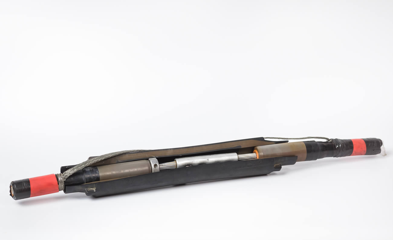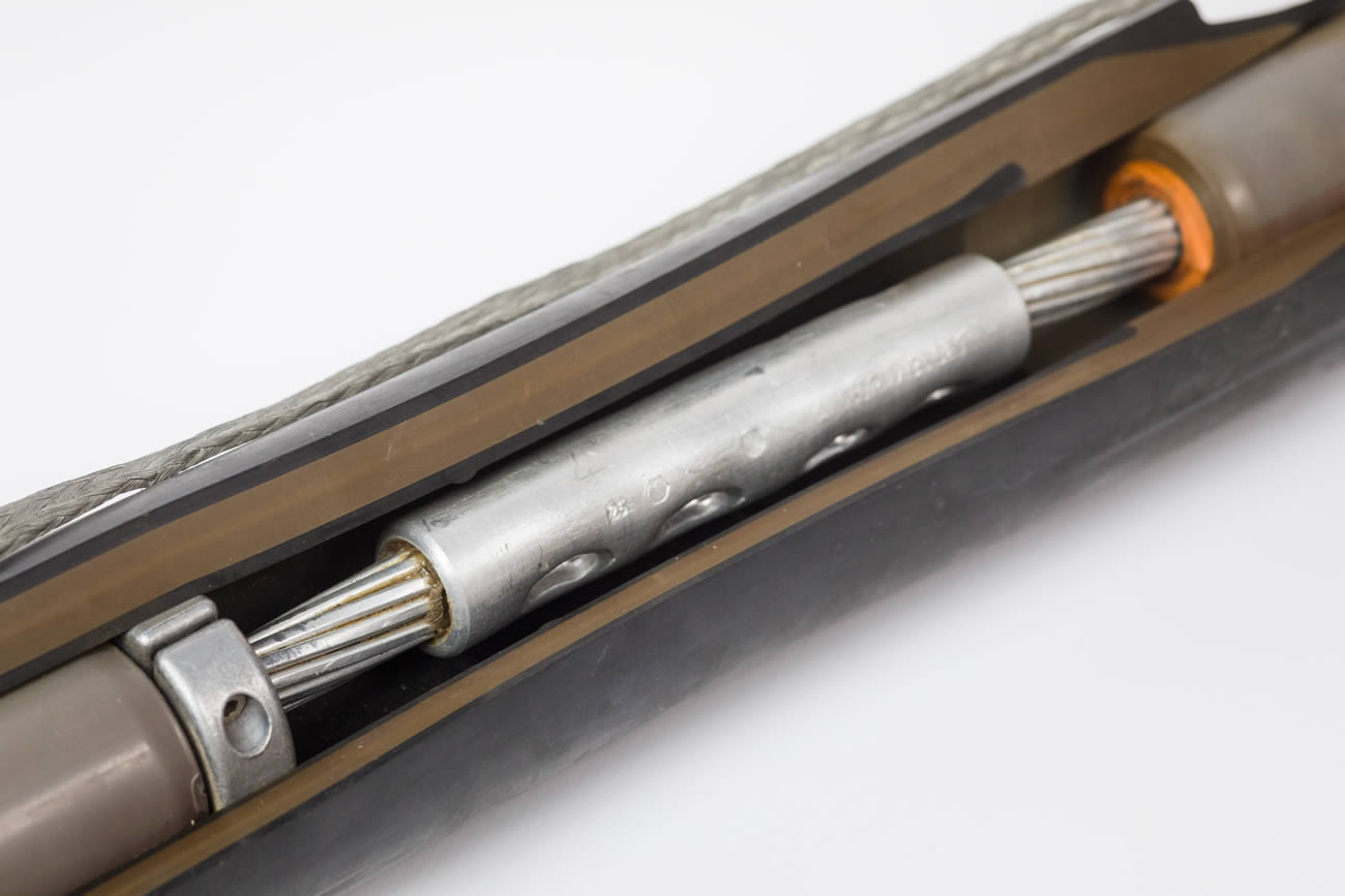 Sección de cable de media tensión, probablemente punto de empalme o medición, abierto lateralmente para su exposición.