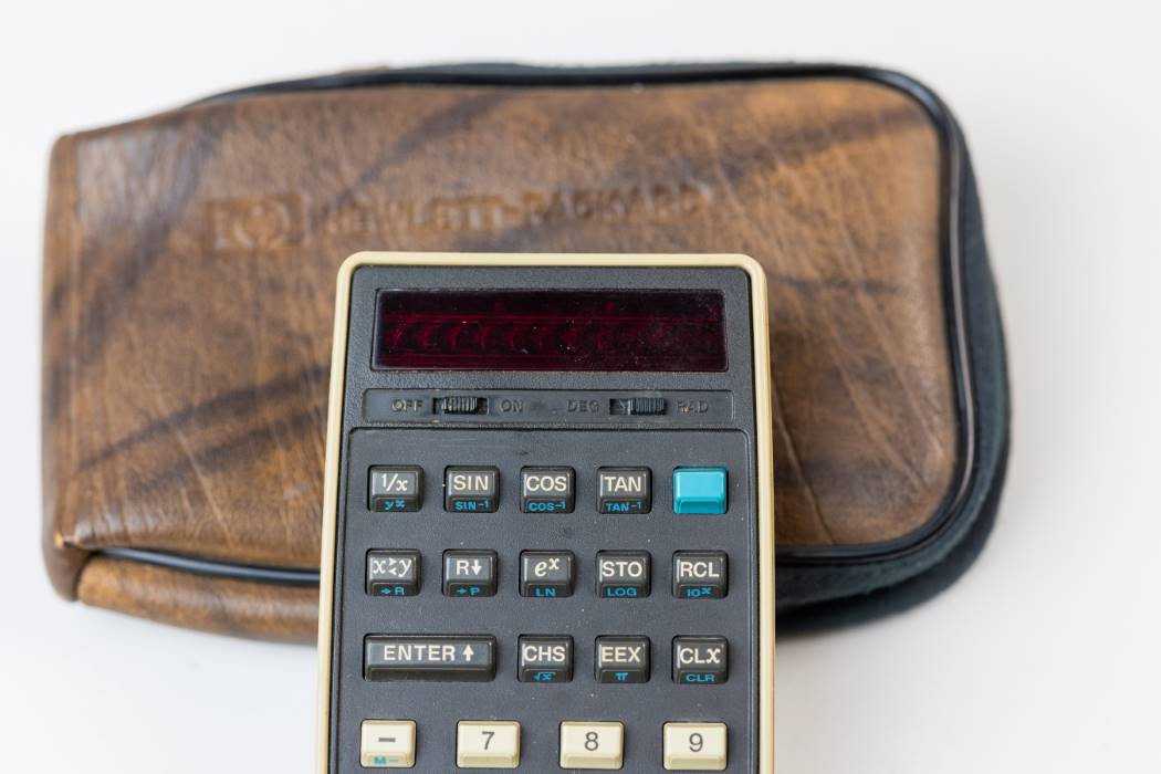Calculadora electrónica científica de bolsillo HEWLETT-PACKARD en estuche de tela y cuero y manual de instrucciones en castellano. Firma de la garantía del equipo el 16/01/1976. Vendido por Dirac Martí, nº 20