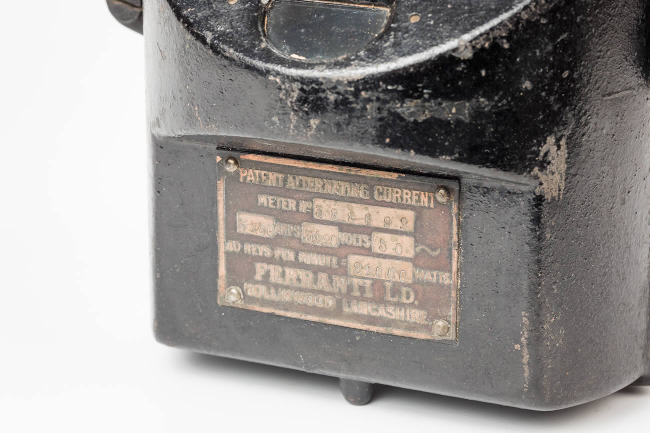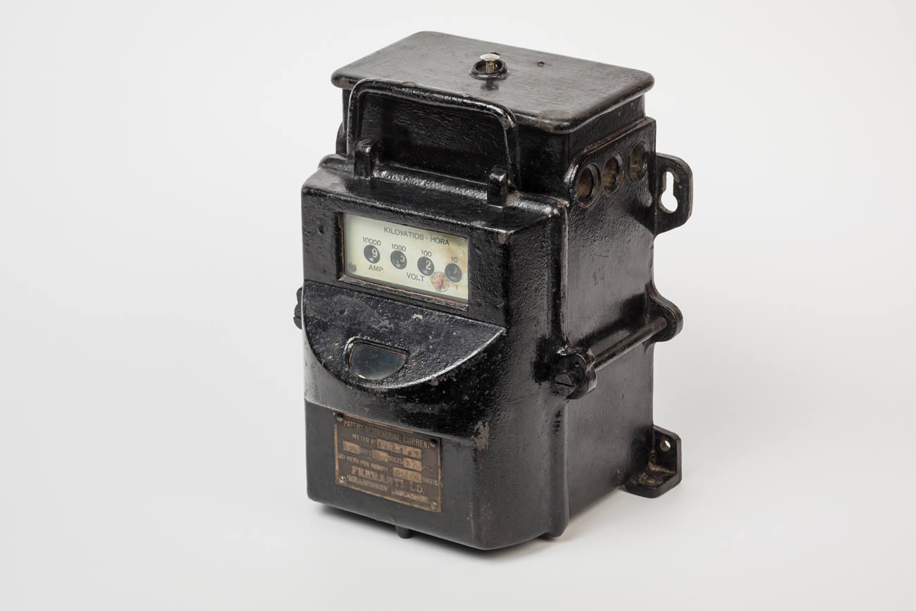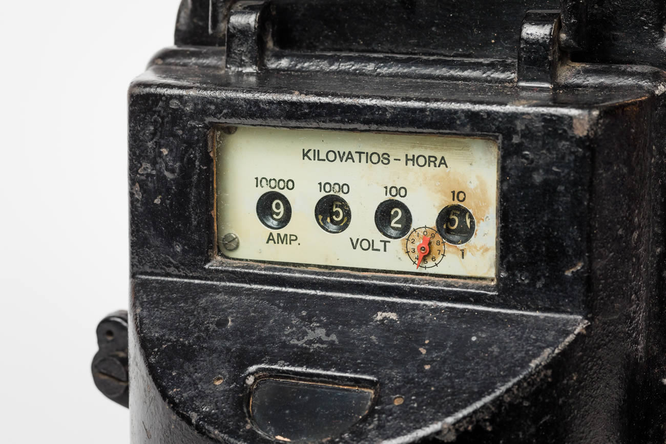 Contador trifásico en carcasa de hierro, con panel de relojería en el frontal para indicar el consumo.