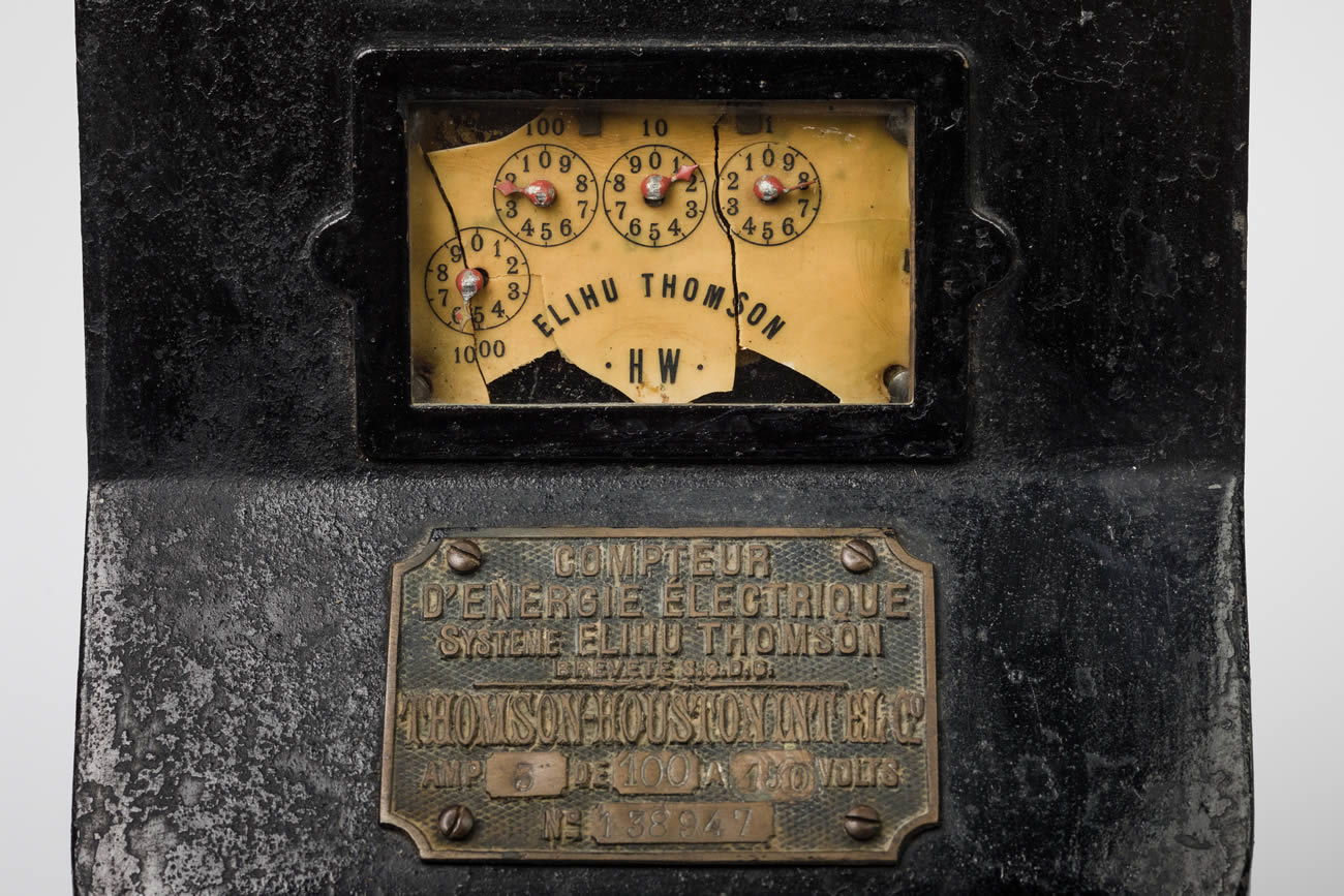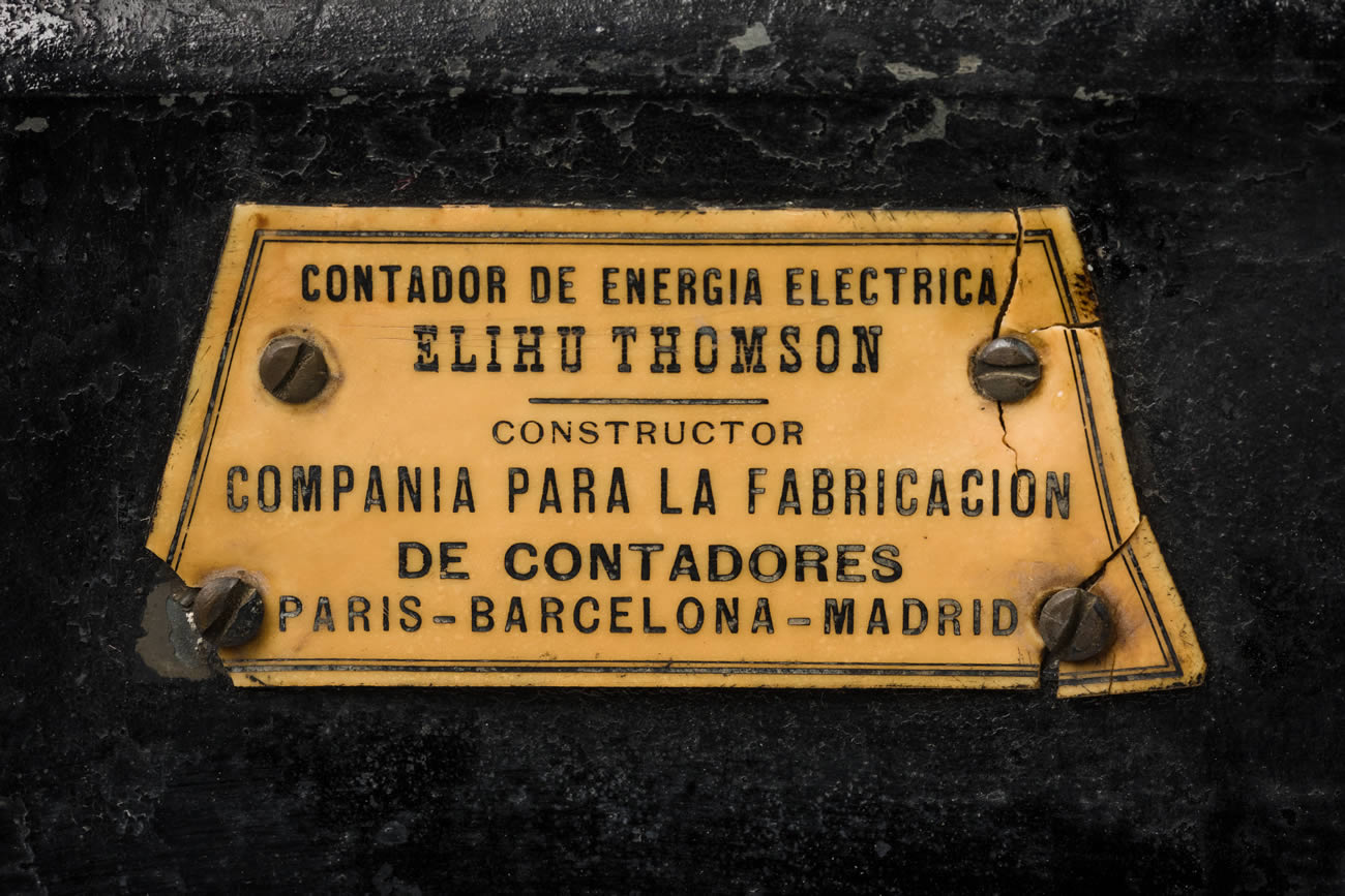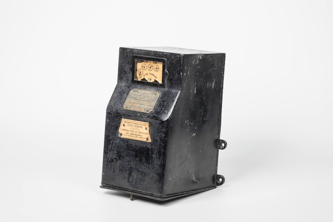 Estamos delante de uno de los contadores más antiguos que conserva el museo. A finales del siglo XIX se hicieron muchas versiones de aparatos para contabilizar el consumo eléctrico, usando distintos sistemas, tanto químicos como mecánicos. En el caso del medidor integrado de Elihu Thomson usaba barras de plata y un disco con un motor que lo hacía girar de manera proporcional al consumo eléctrico, en este caso de corriente continua. Se trata de uno de los primeros sistemas mecánicos que funcionaron con eficiencia.