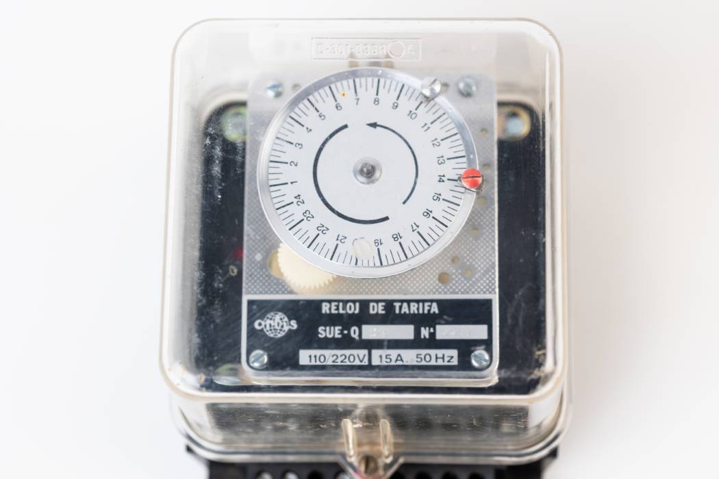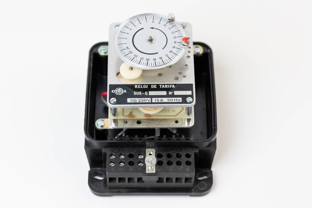 Reloj de tarifa con cubierta, fabricado en España por la empresa ORBIS, modelo SUE-Q 2T nº serie 3317, entre 1950-1980. Realizado en metal y plástico.