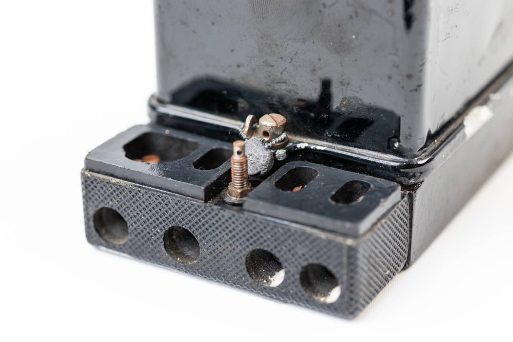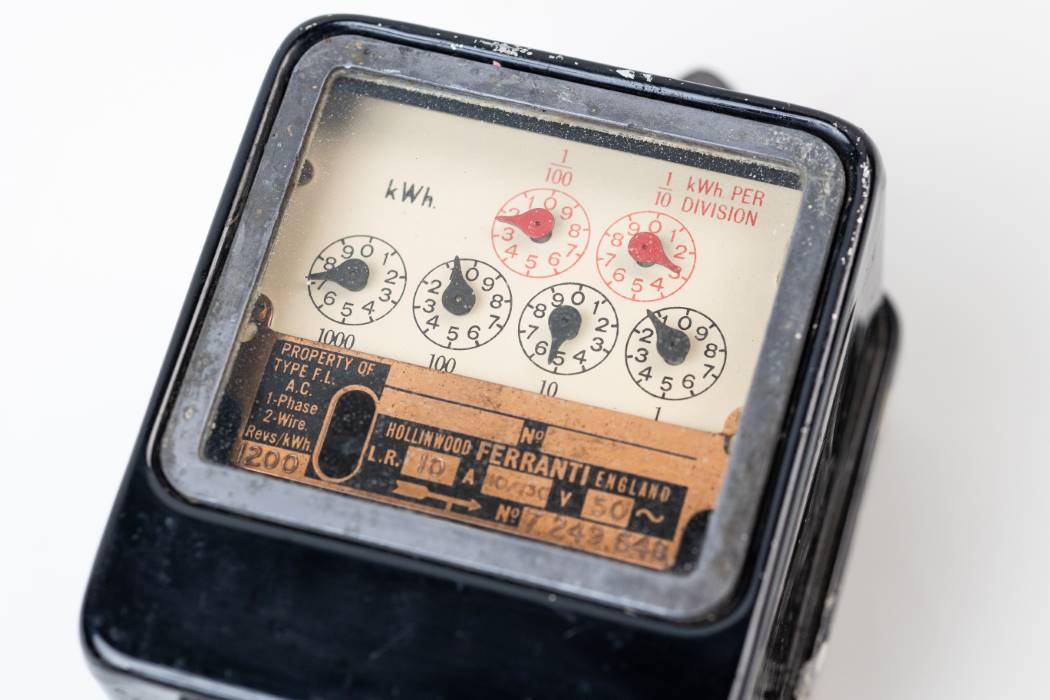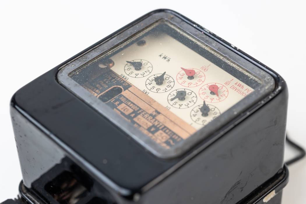 Contador eléctrico monofásico para corriente alterna, instalación en superficie, fabricado por la empresa Ferranti Ld, en Inlgaterrra antes de 1952. Con cubierta de hierro, con sellos de plomo y etiqueta
