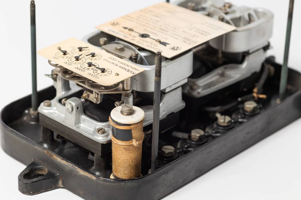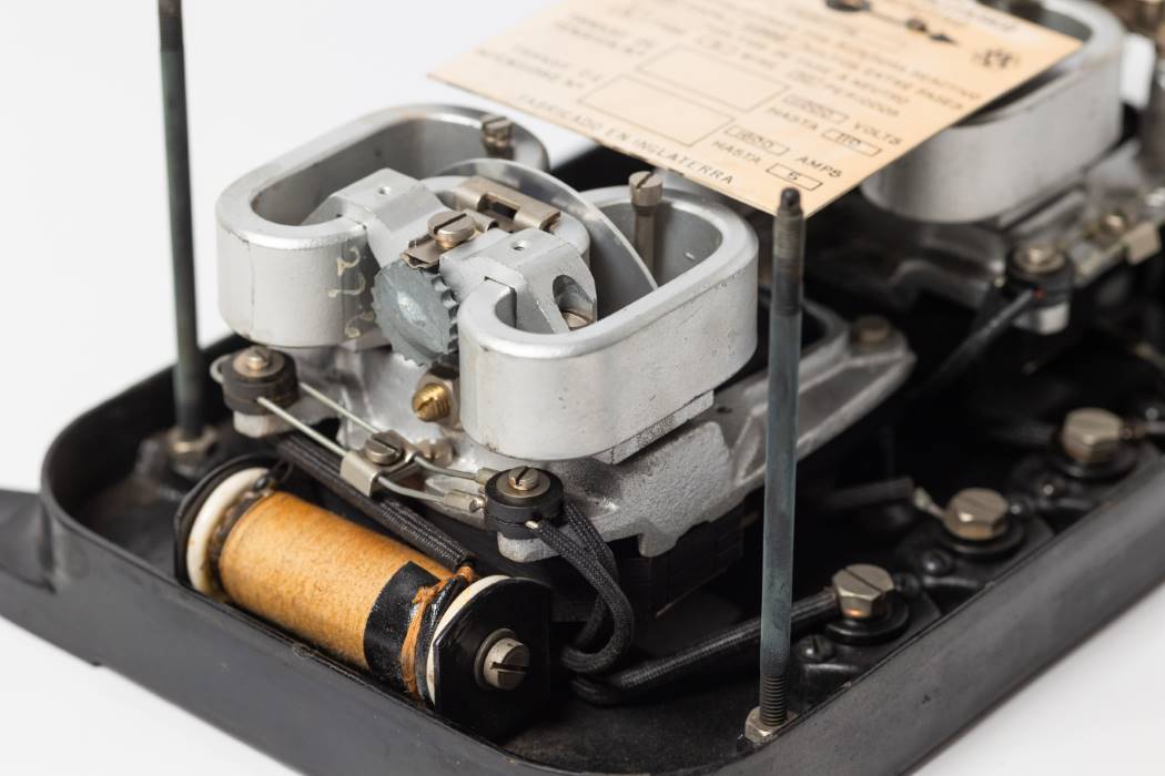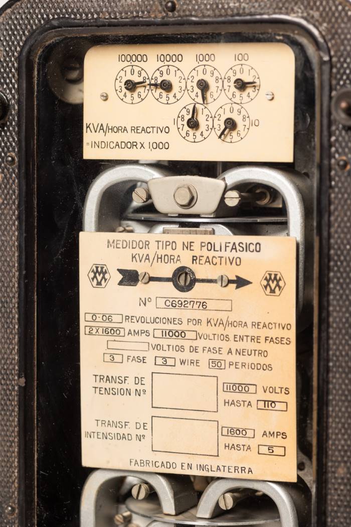 Contador trifásico reactivo para hogares, locales y fabricas. Fabricado por MV en Inglaterra, modelo NE y número de serie C692776. Carcasa protección hierro y cristal.