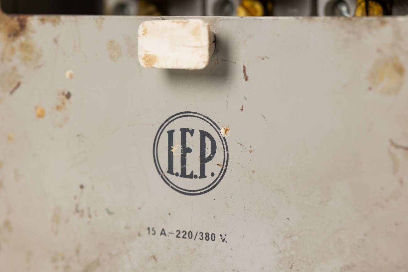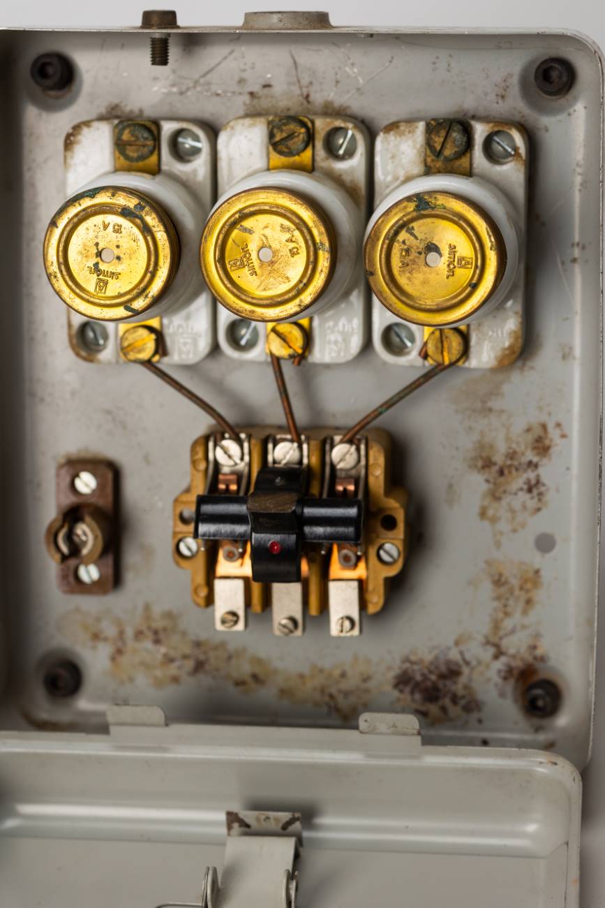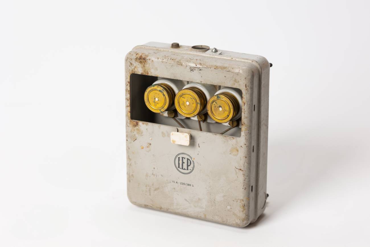 Interruptor/caja con fusibles de rosca BT, en caja metálica con tapa. Abertura deslizante de ventana para accesor. Patas regulables con tornillos y tuercas para des/enroscar. Donado por TEN.