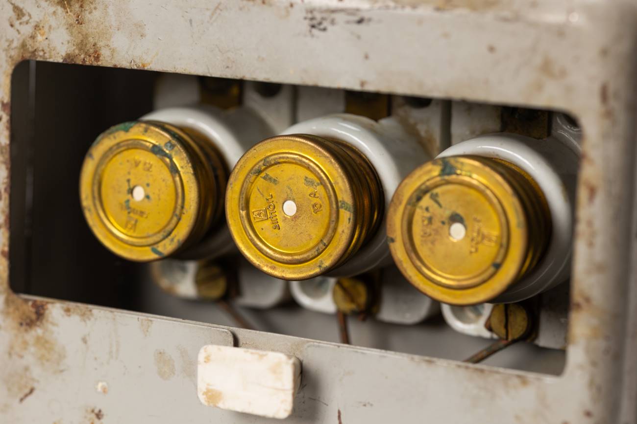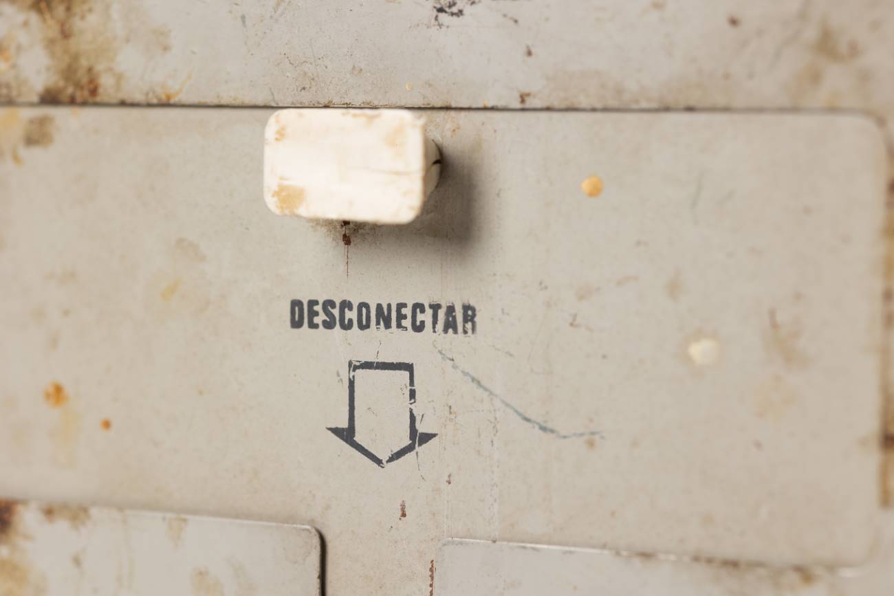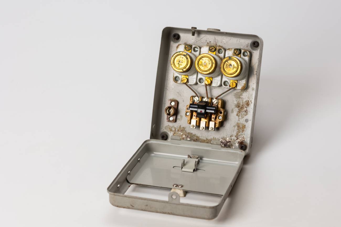 Interruptor/caja con fusibles de rosca BT, en caja metálica con tapa. Abertura deslizante de ventana para accesor. Patas regulables con tornillos y tuercas para des/enroscar. Donado por TEN.