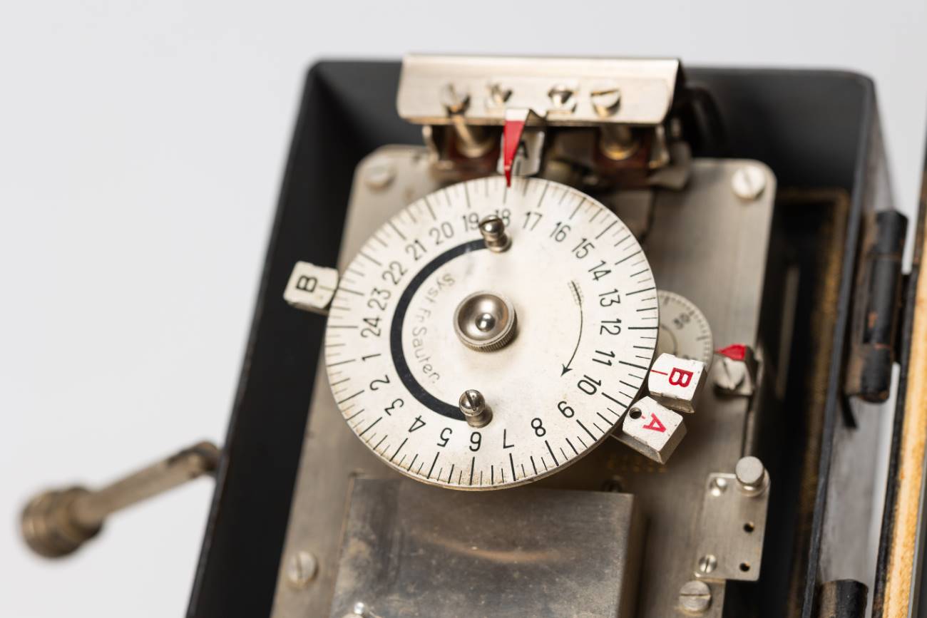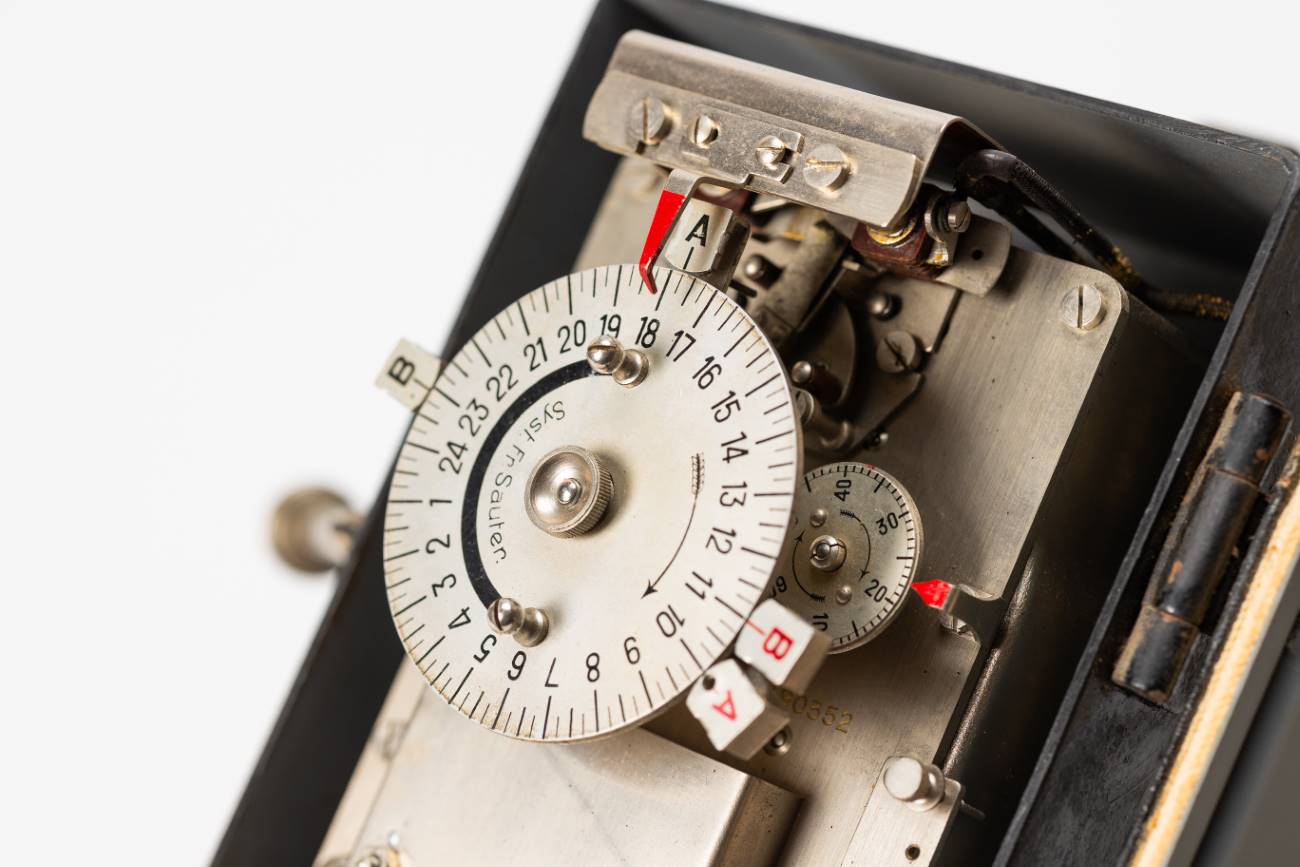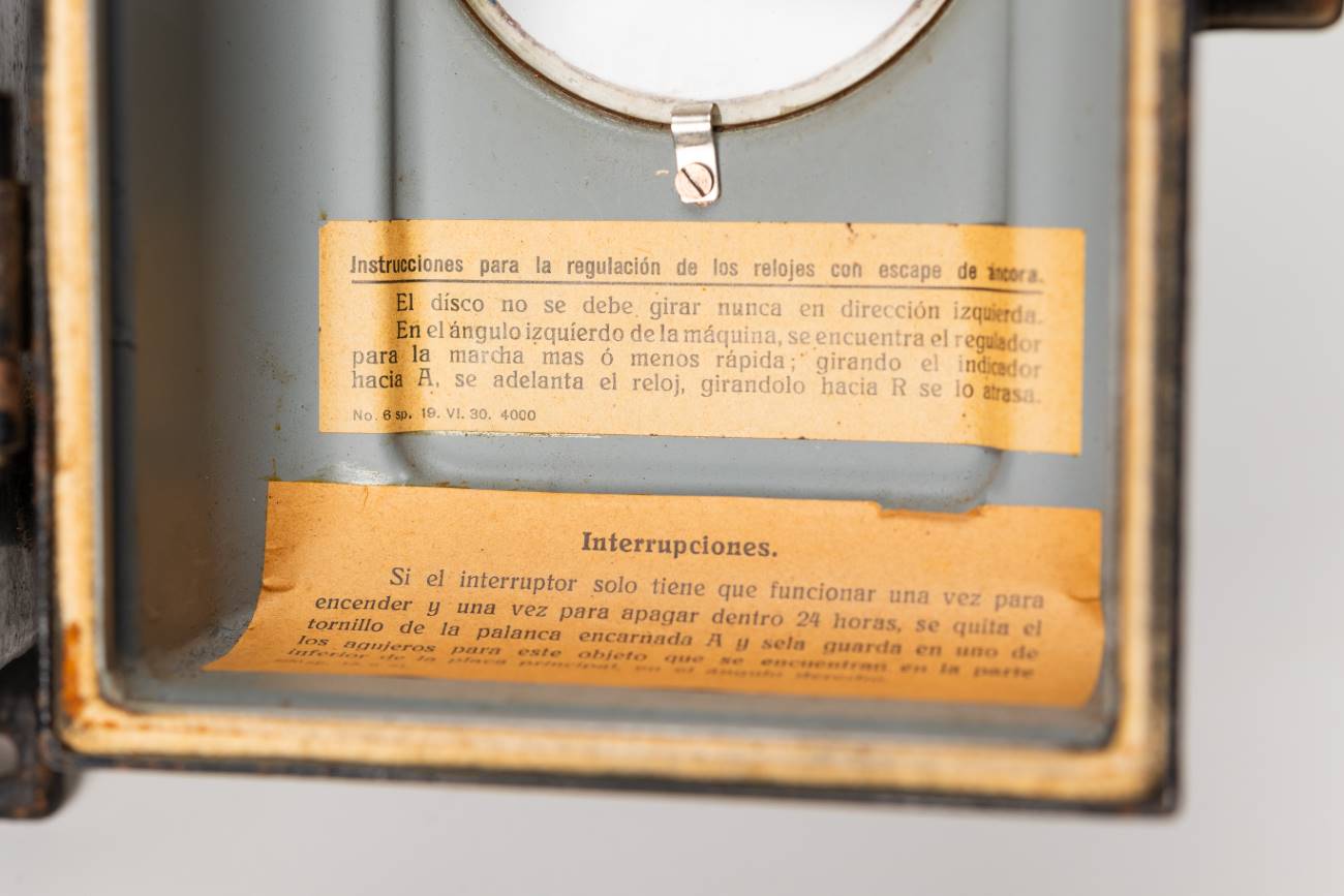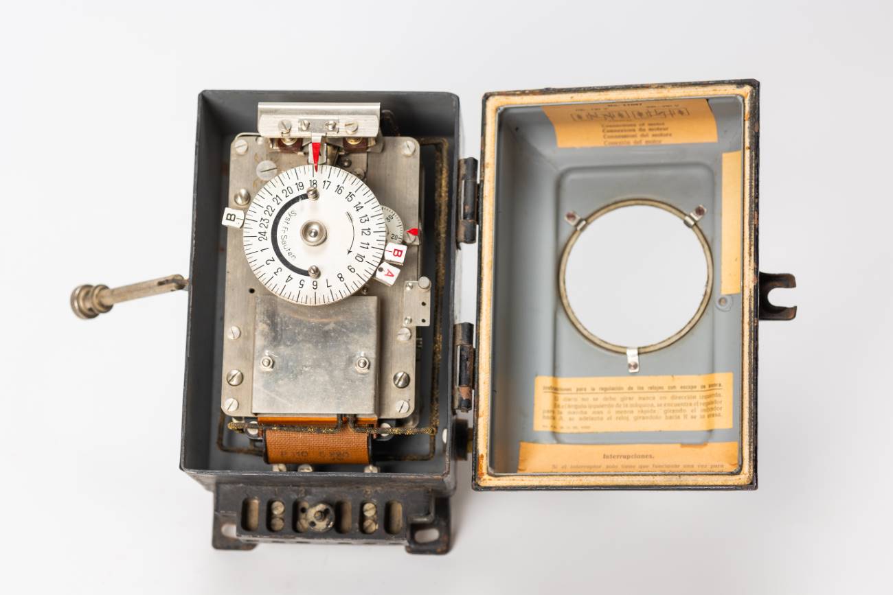 Interruptor horario de doble tarifa analógico en estuche de metal con tapa y cierre de tornillo en el lateral izquierdo. Visagras en el lateral derecho.
