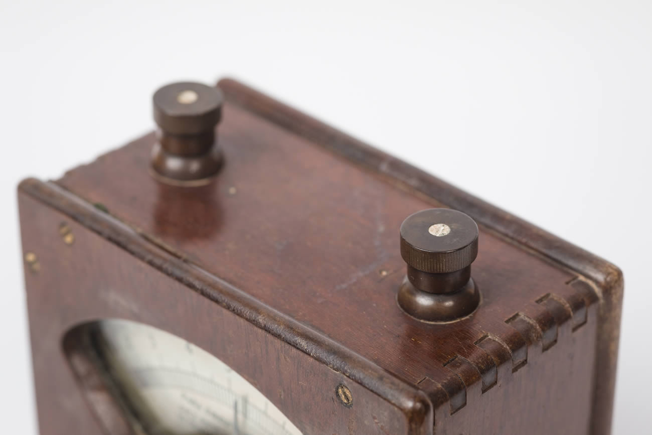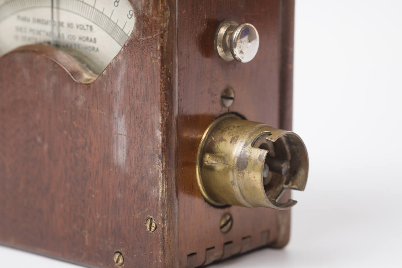 En caja de madera con indicador en el frontal y 2 bornes de conexión en la parte superior.