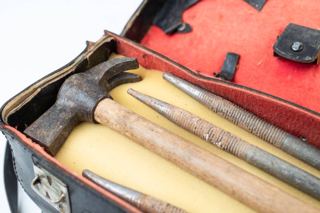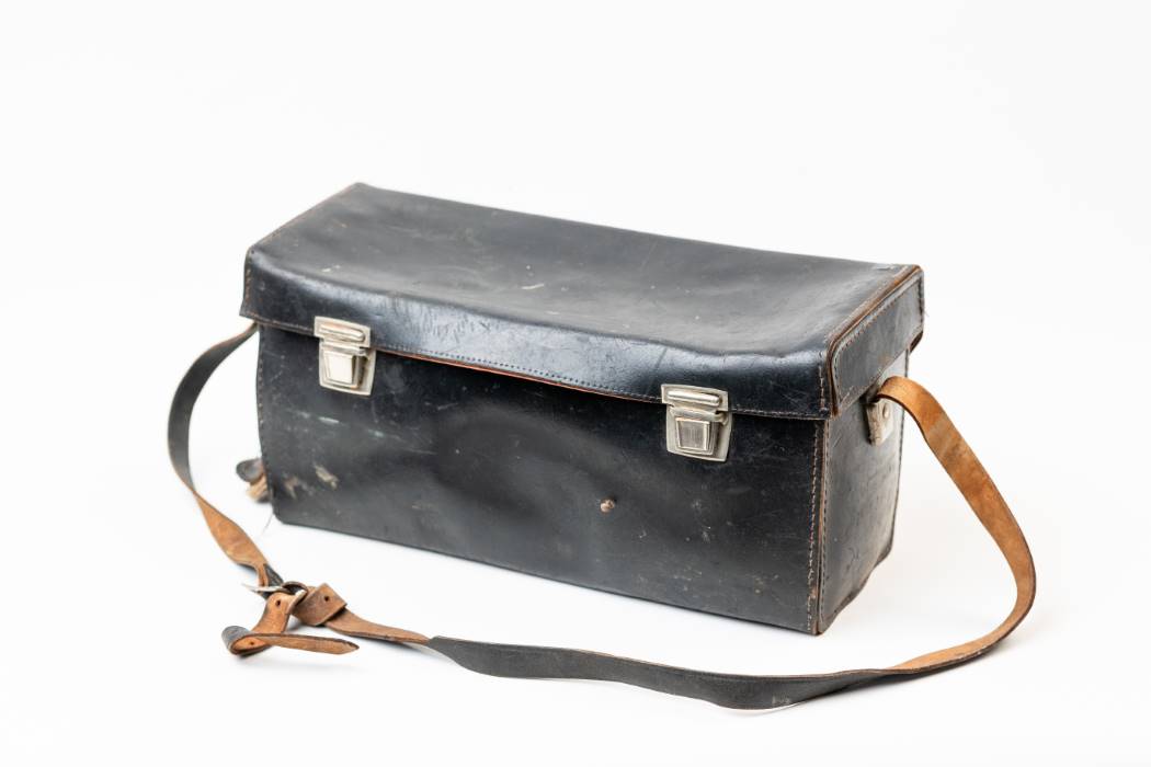 Medidor electrostático de la resistencia de tierra y resistividad del terreno, fabricado por NORMA, en Austria, modelo ERDUNGSMASSER. Se encuentra en su caja de cuero y fieltro con cableado, 4 piquetas y un martillo. Donada por JOAQUÍN CANÓS