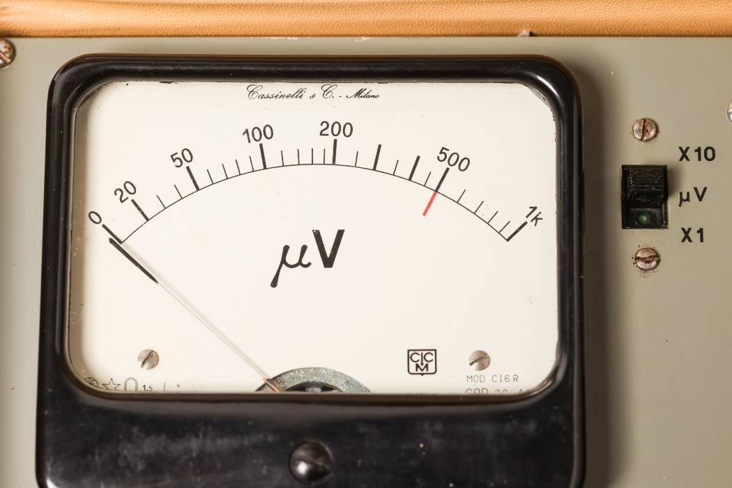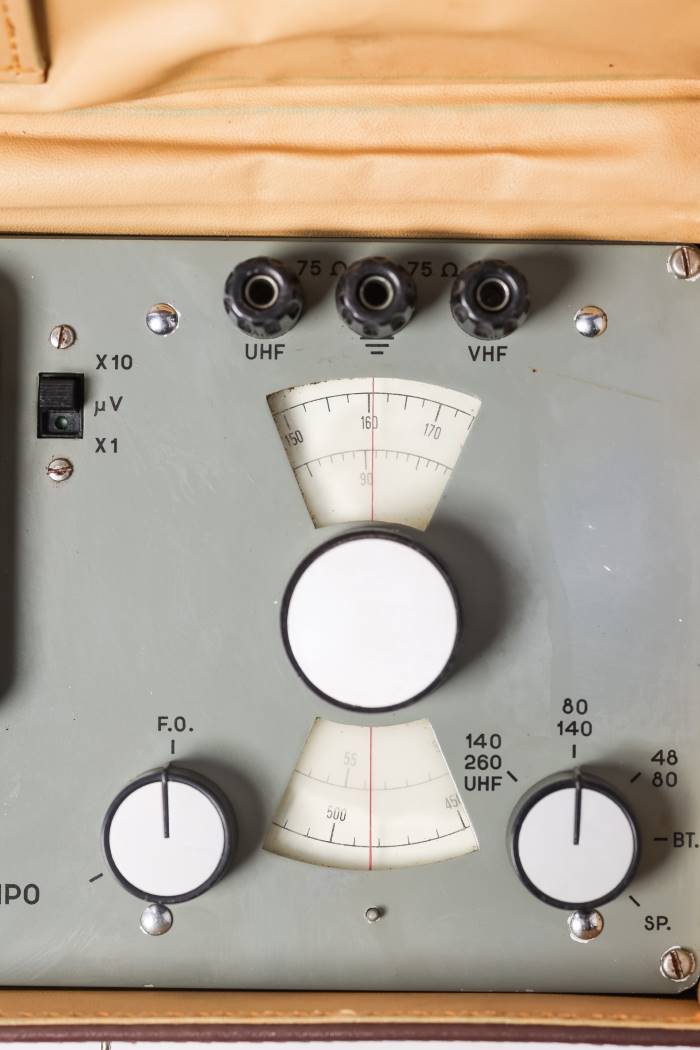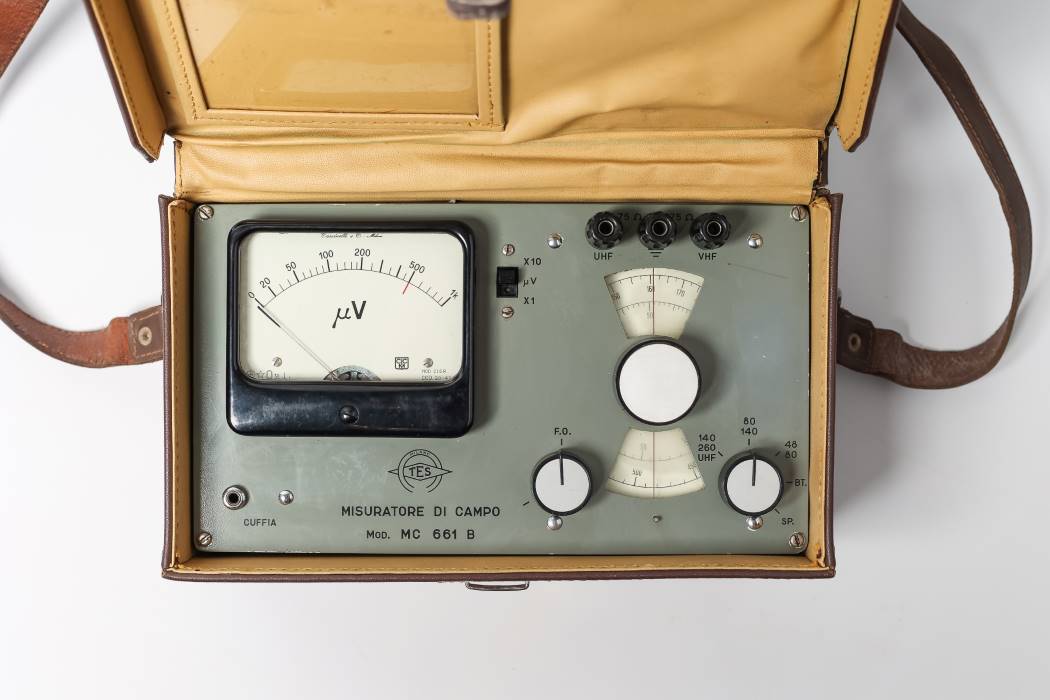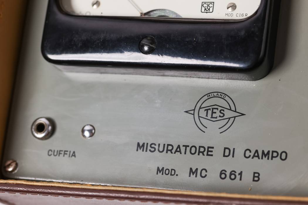 Medidor de campo de voltaje fabricado por la empresa Tecnica Elettronica System, Milan, modelo MC 661B. Gama de ondas VHF/UHF. Para el transporte del instrumento va en maleta de cuero perfectamente ajustada al volumen del equipo.