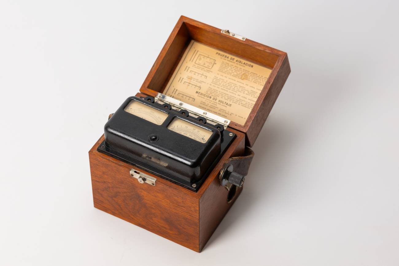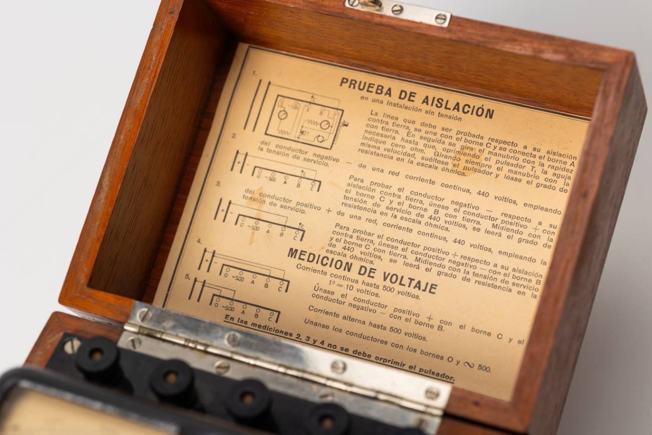 Instrumento portátil con circuito de hierro inserto en una caja de madera con asa de cuero para su manejo y transporte. Presenta cinco bornes de baquelita (0, 500, A ,B y C) y dos medidores: uno para la tensión de servicio (0-500) y otro para la resistencia óhmica. Con manubrio lateral.