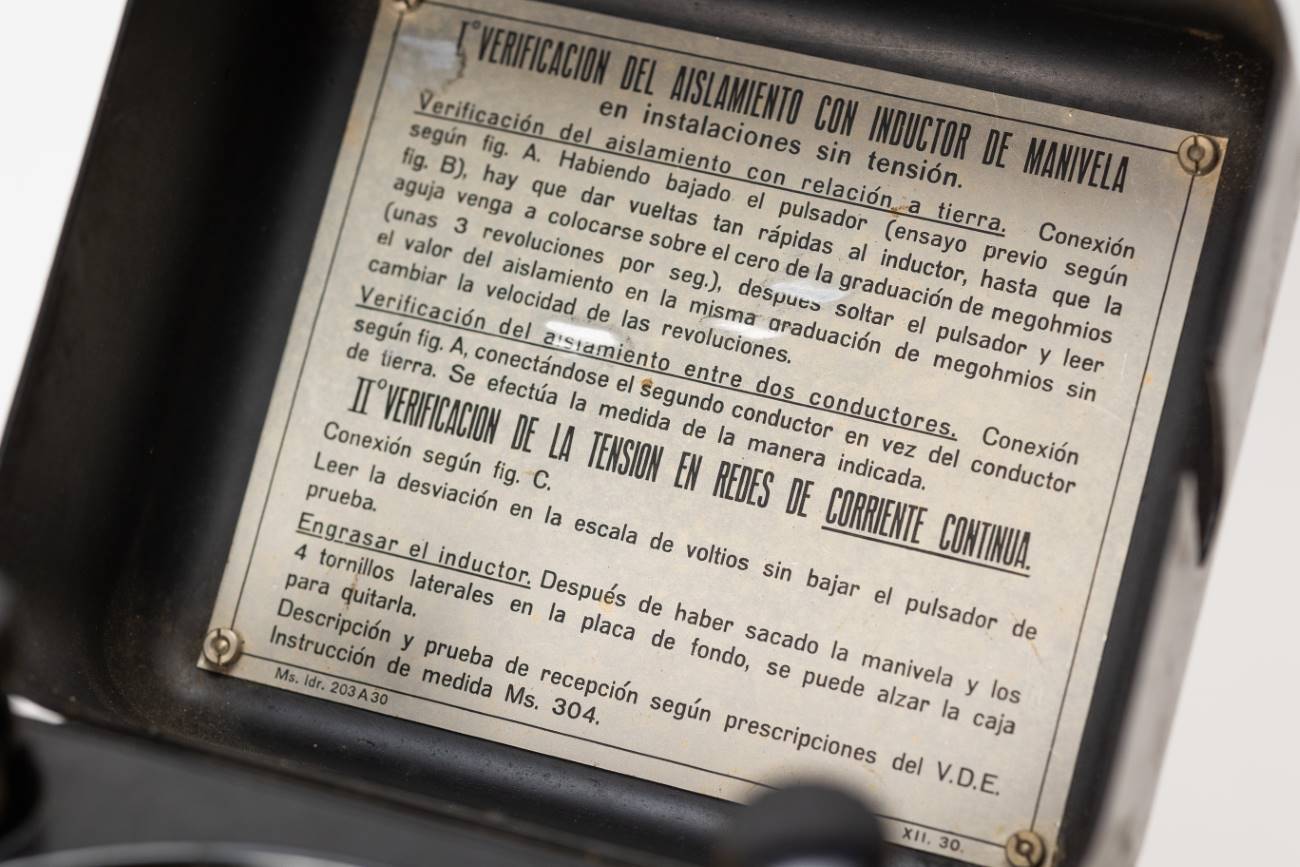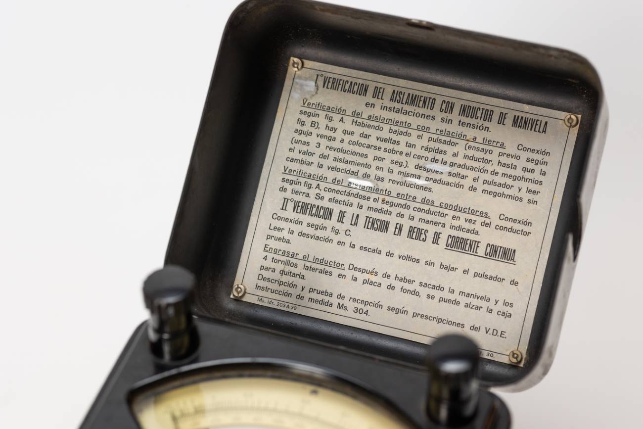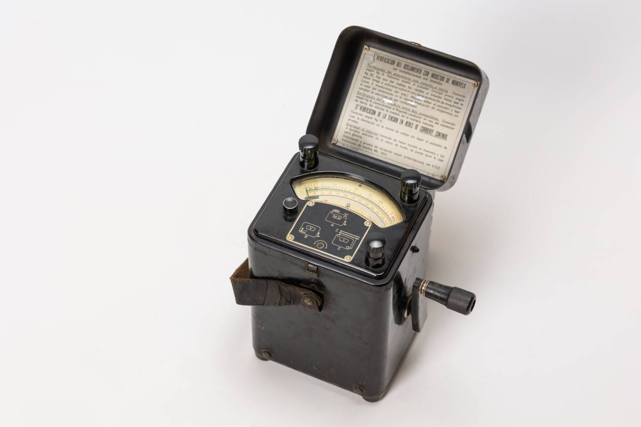 Megóhmetro. Verificador de tensión y de aislamiento en estuche de metal portátil, con correa de cuero. Manivela metálica en la parte derecha. Fabricado por Siemens & Halske en Alemania entre 1899-1925.