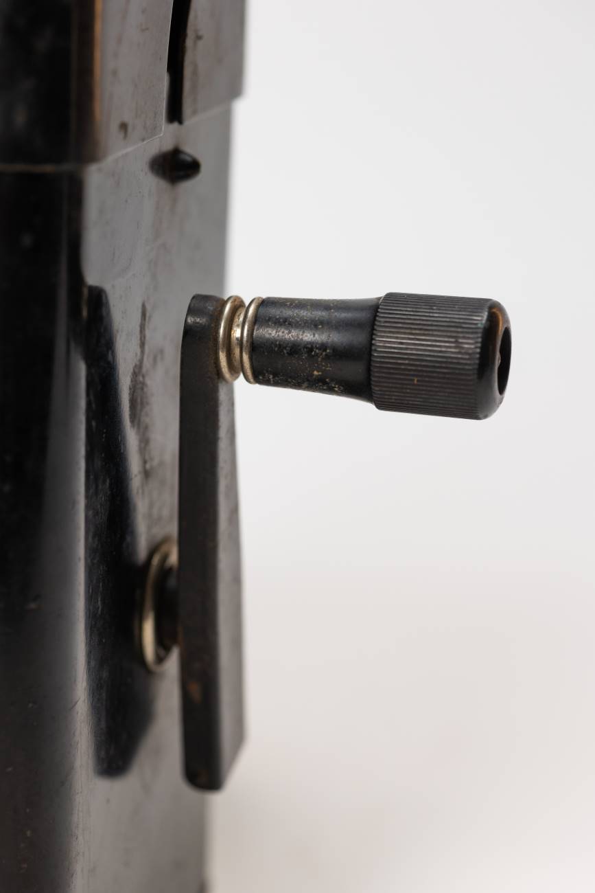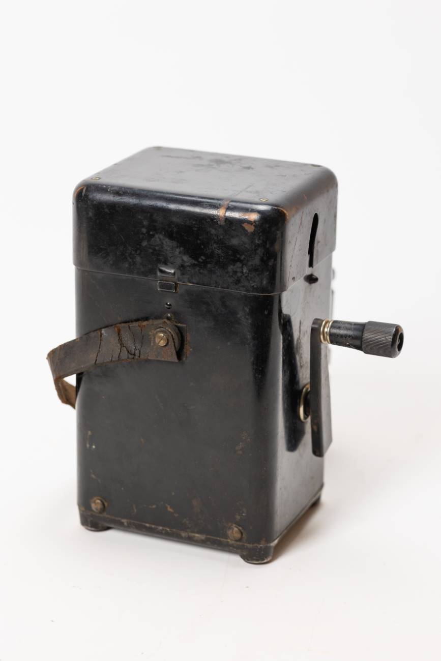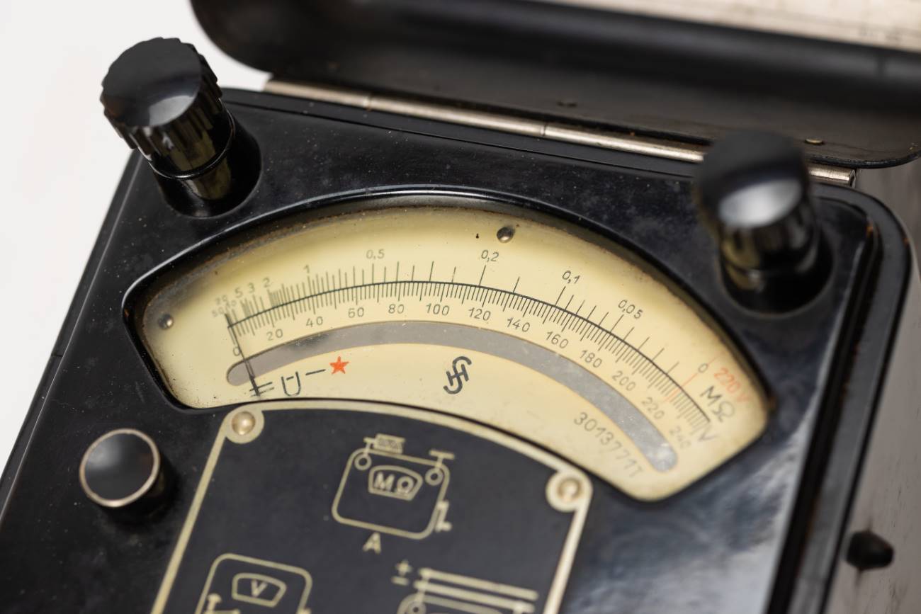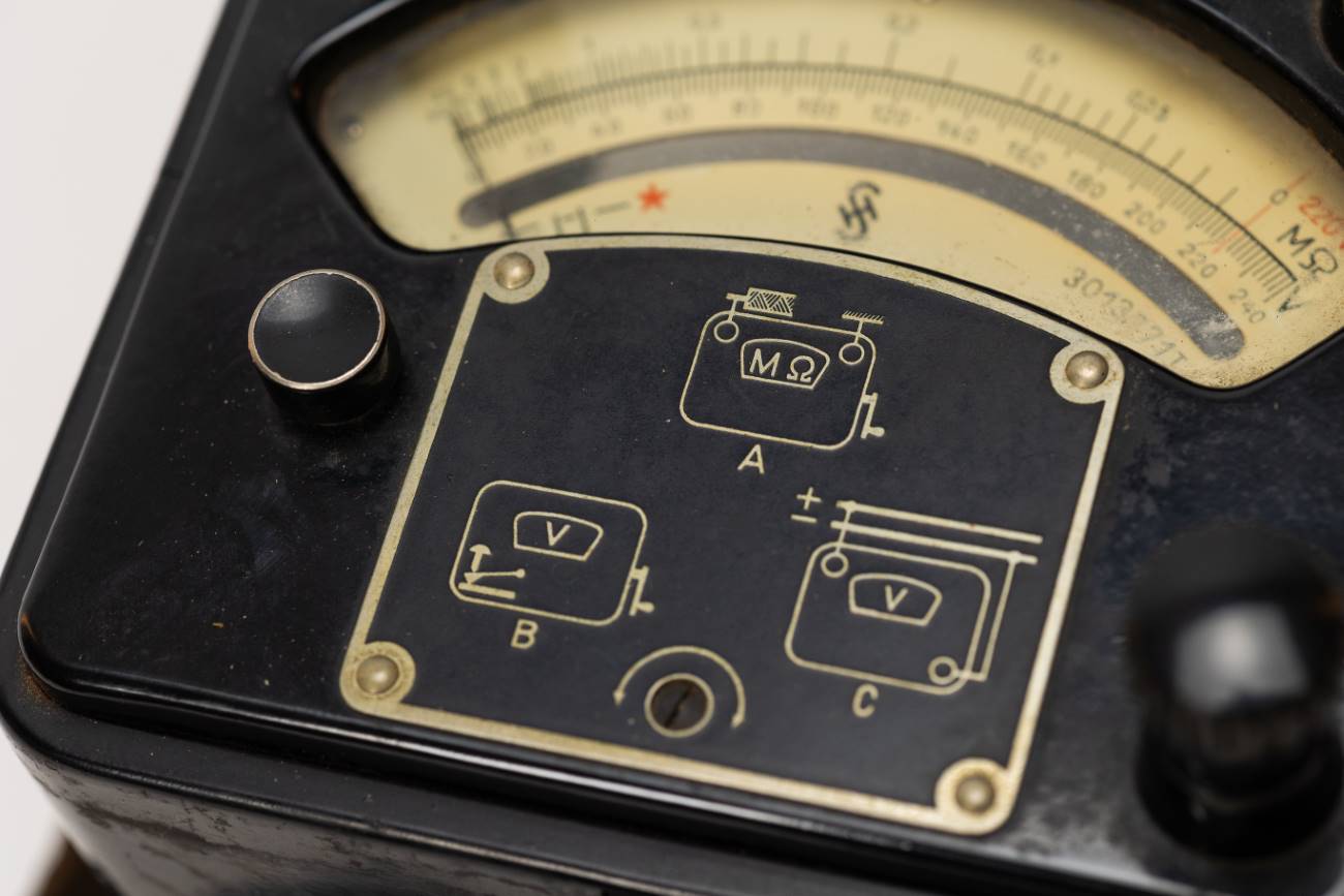Megóhmetro. Verificador de tensión y de aislamiento en estuche de metal portátil, con correa de cuero. Manivela metálica en la parte derecha. Fabricado por Siemens & Halske en Alemania entre 1899-1925.