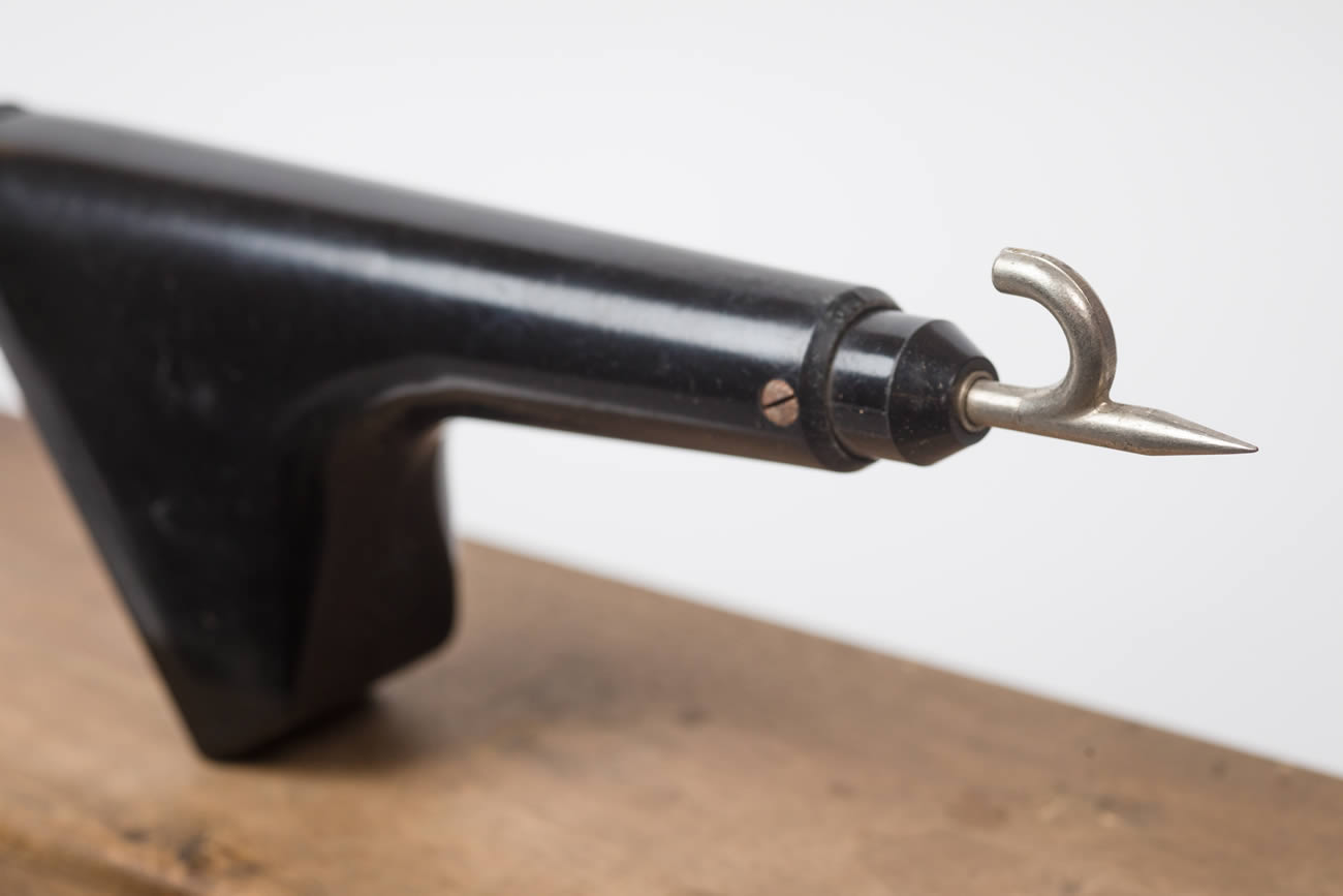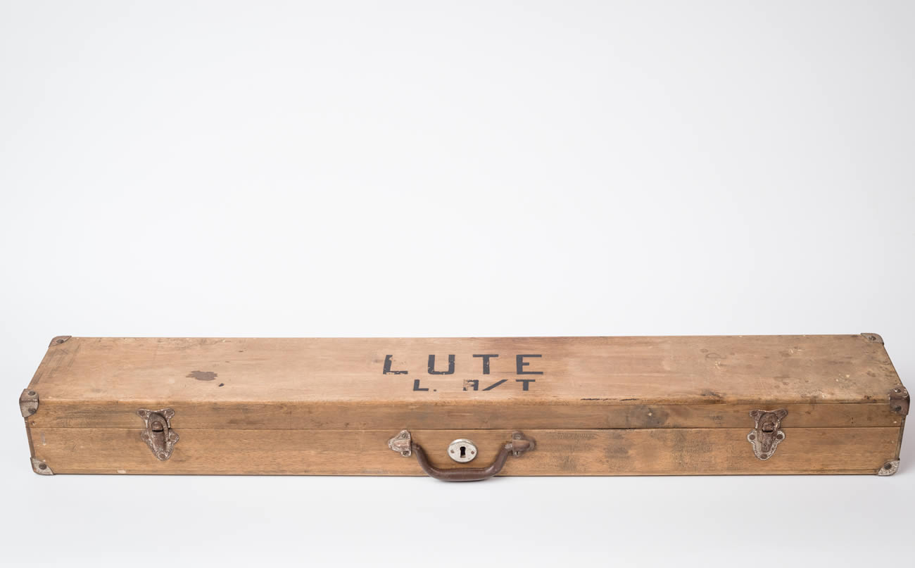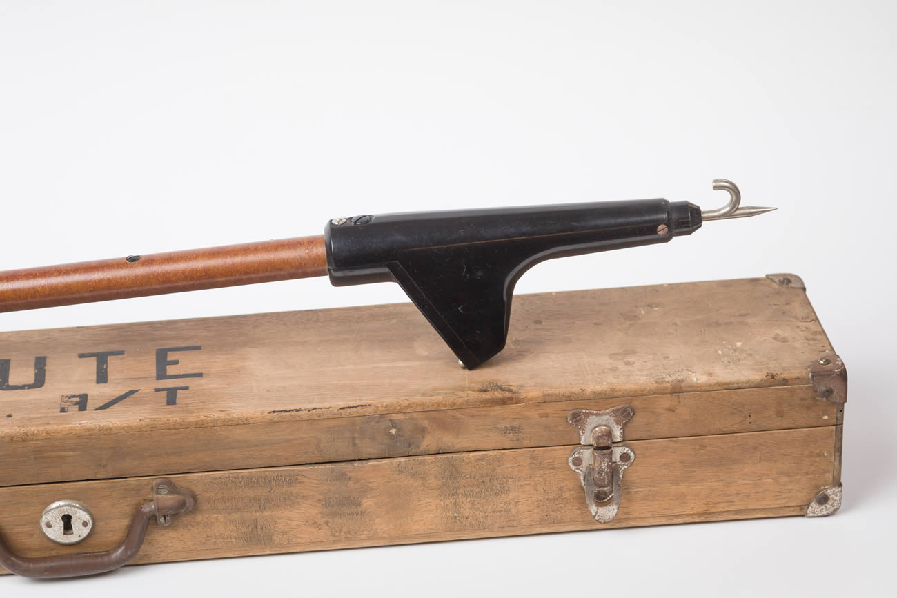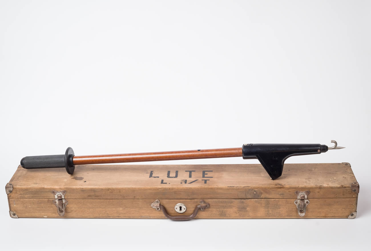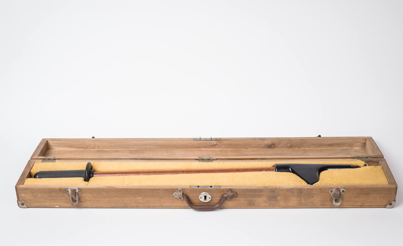 Estuche de madera que contiene una pértiga de comprobación de fases para cables de media o alta tensión.