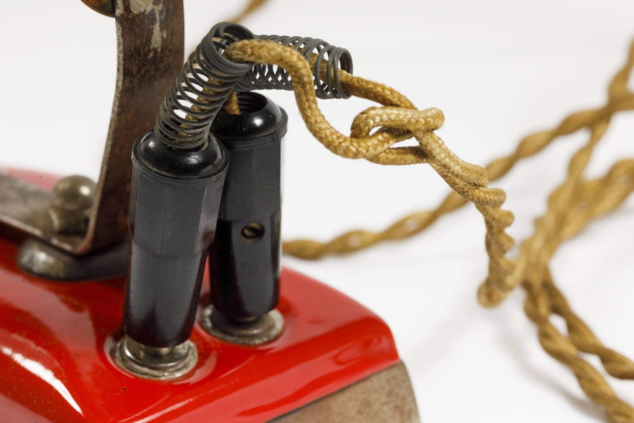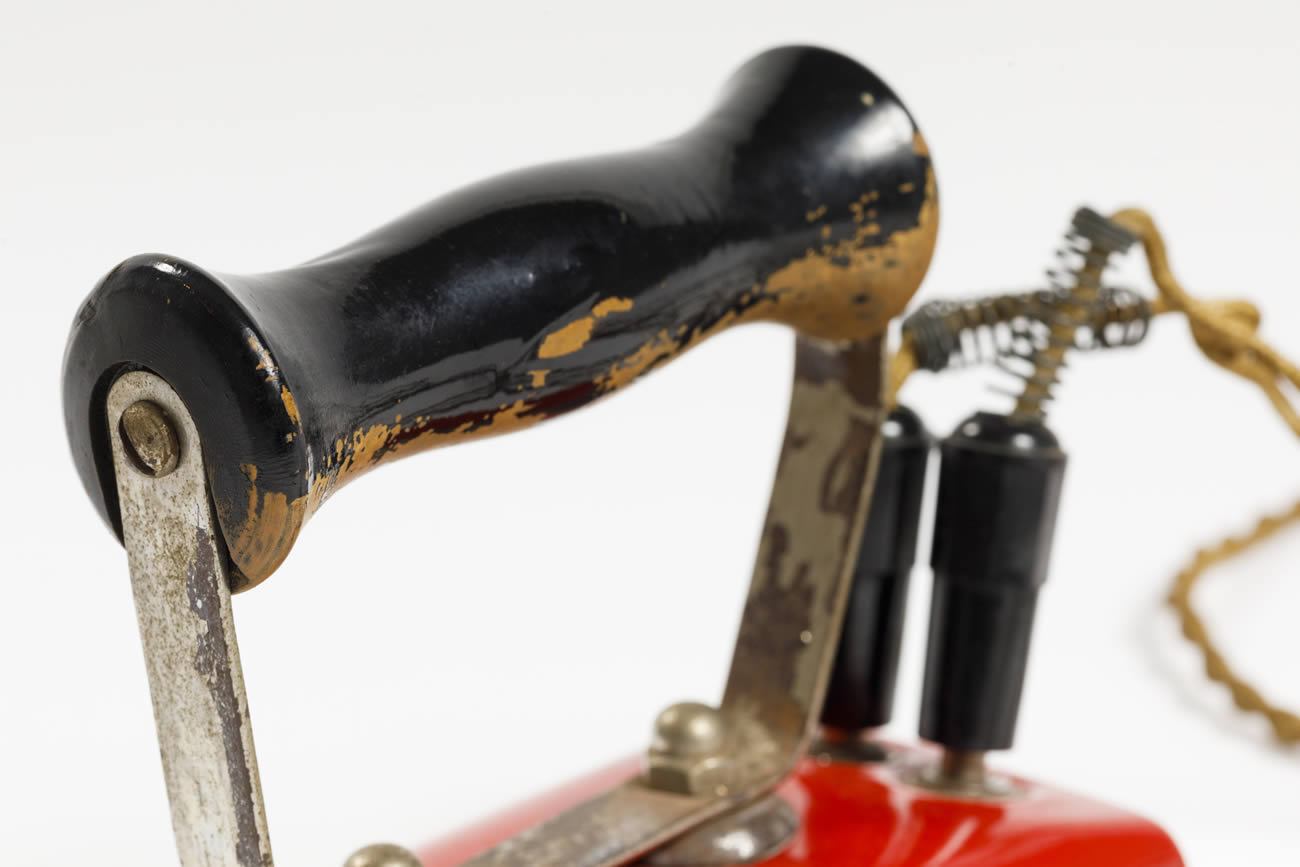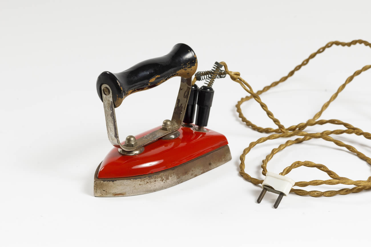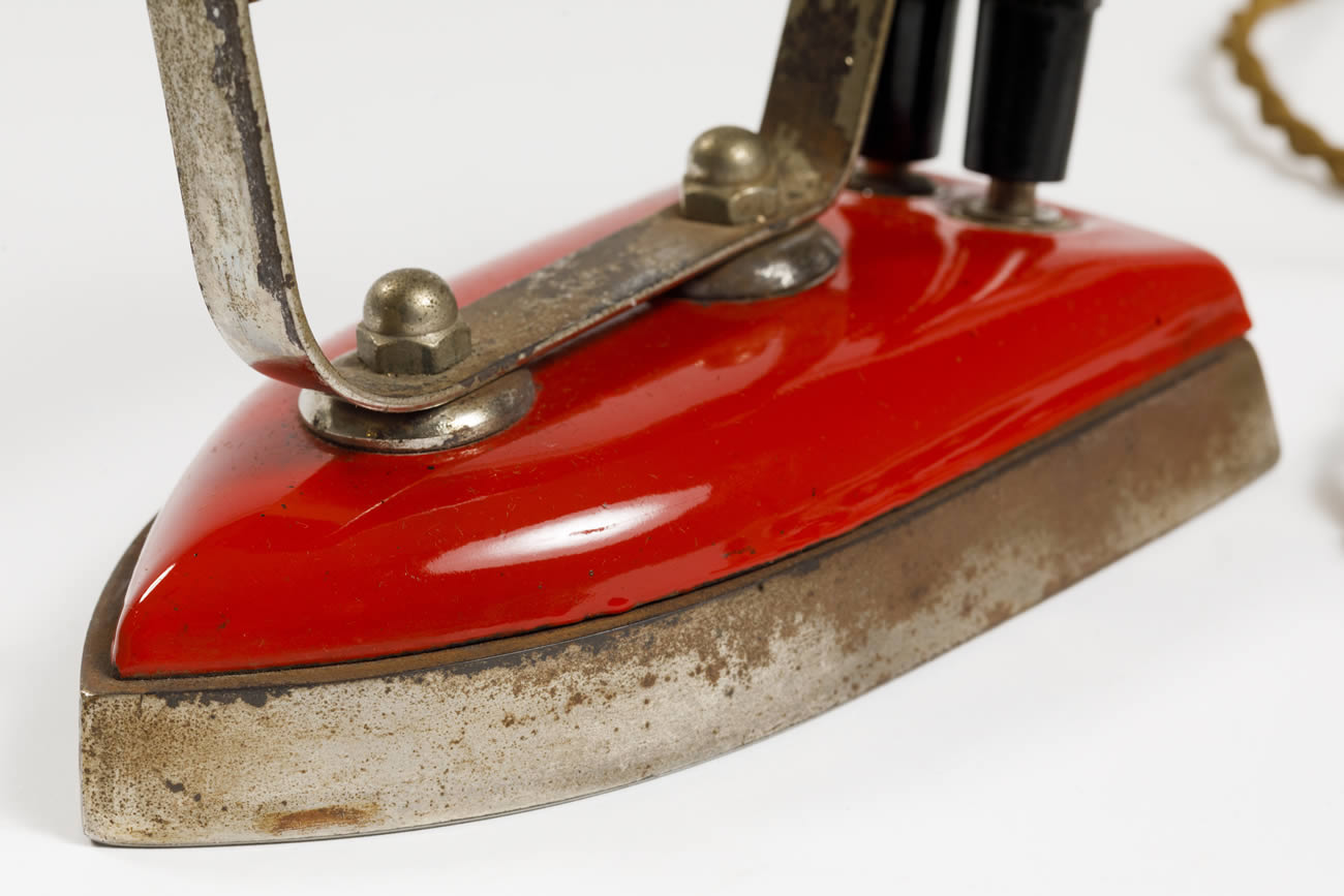 Plancha eléctrica de acero pintada en rojo, con asa superior de madera. Incluye conexión y cable eléctrico con enchufe.