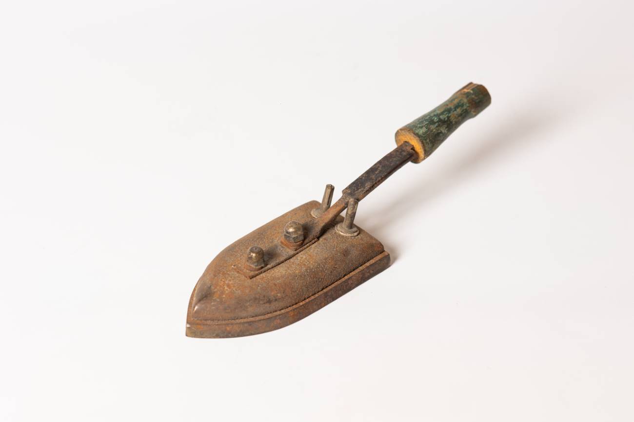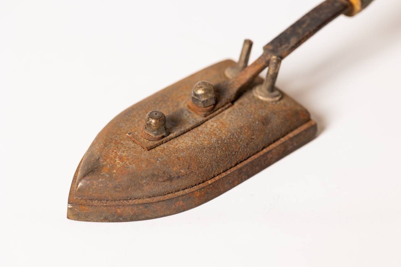 Plancha eléctrica para ropa o tejidos sin cable de alimentación ni enchufe. Mango de madera y dos conectores (polos) con funda protectora para conectar.