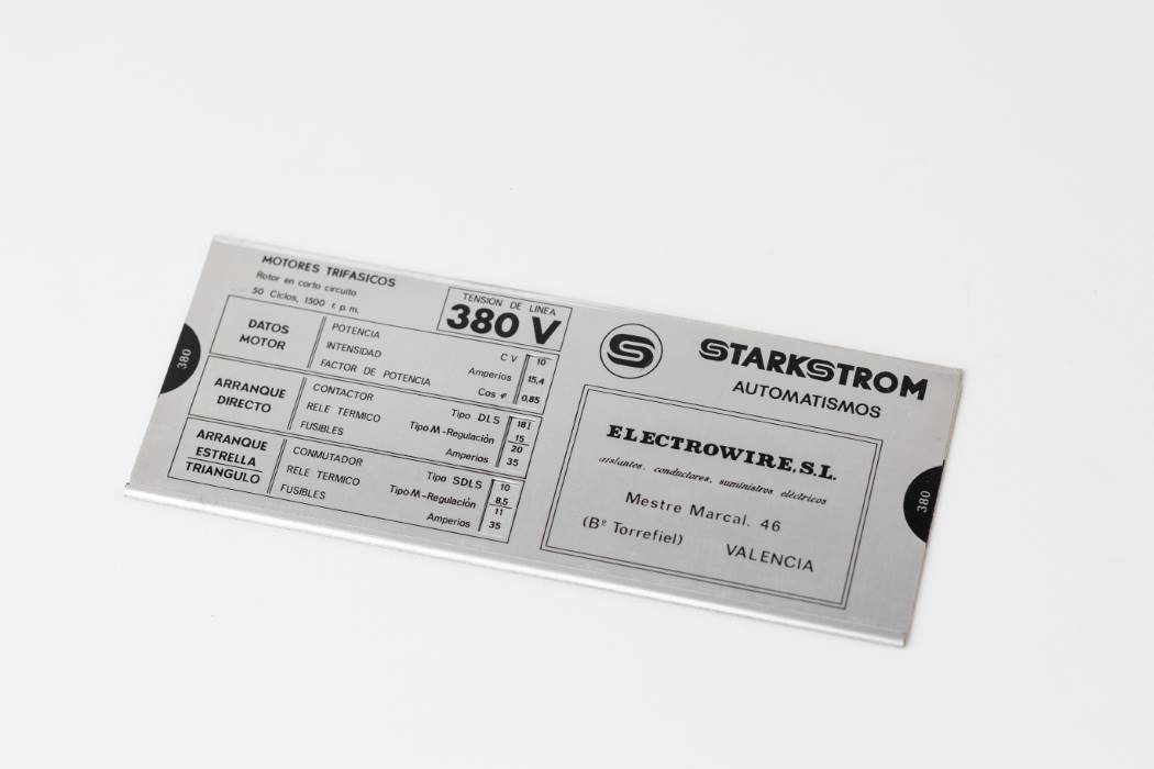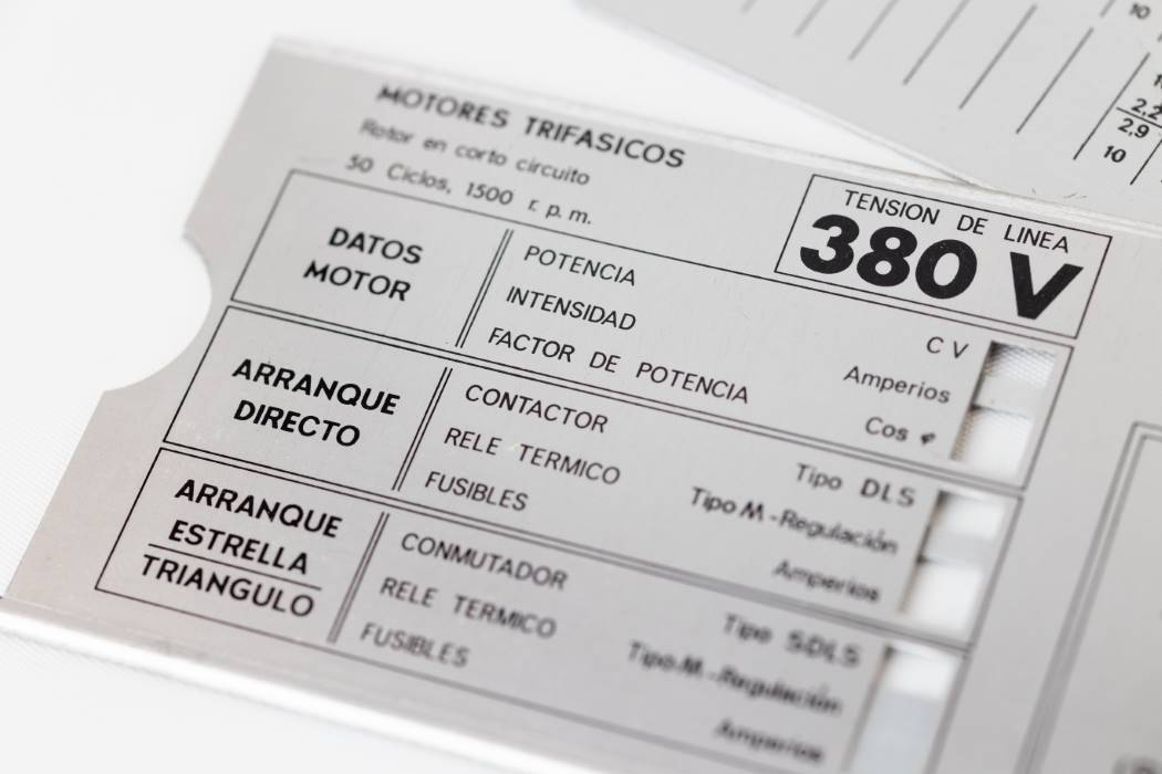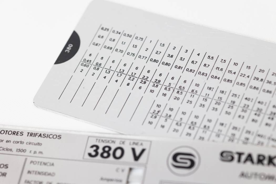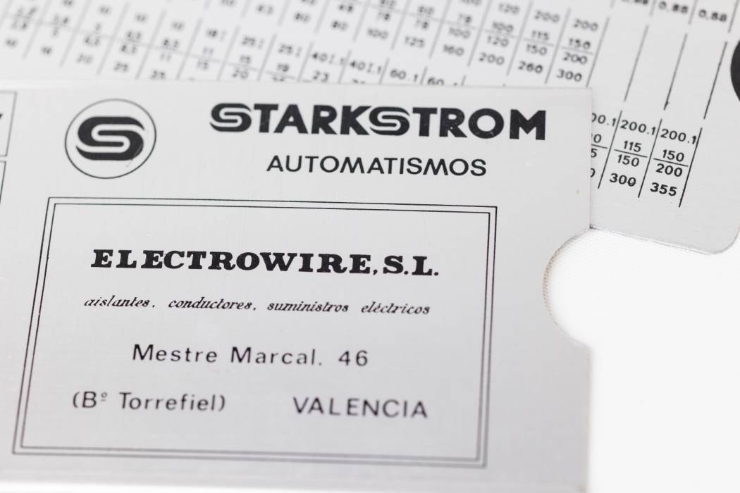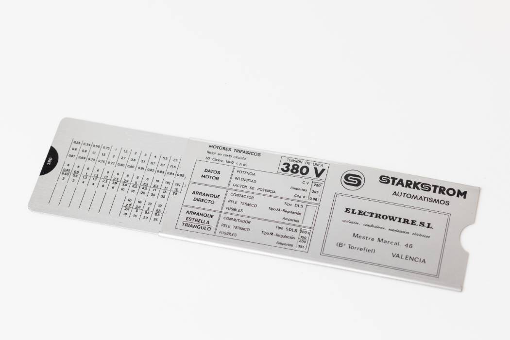 Tabla de cálculo con reglas para motores trifásicos. Elección de la maniobra para puesta en marcha de un motor en función de su potencia y tensión de línea, mediante regla móvil que se halla en el interior de pieza fija. Material utilizado plancha metálica. El fabricante es STARKSTROM, y lleva en recuadro el nombre de la empresa distribuidora (ELECTROWIRE, SL. aislantes, conductores, suministros eléctricos. Mestre Marcal, 46 (Bº Torrefiel), Valencia. Va en funda de plástico.