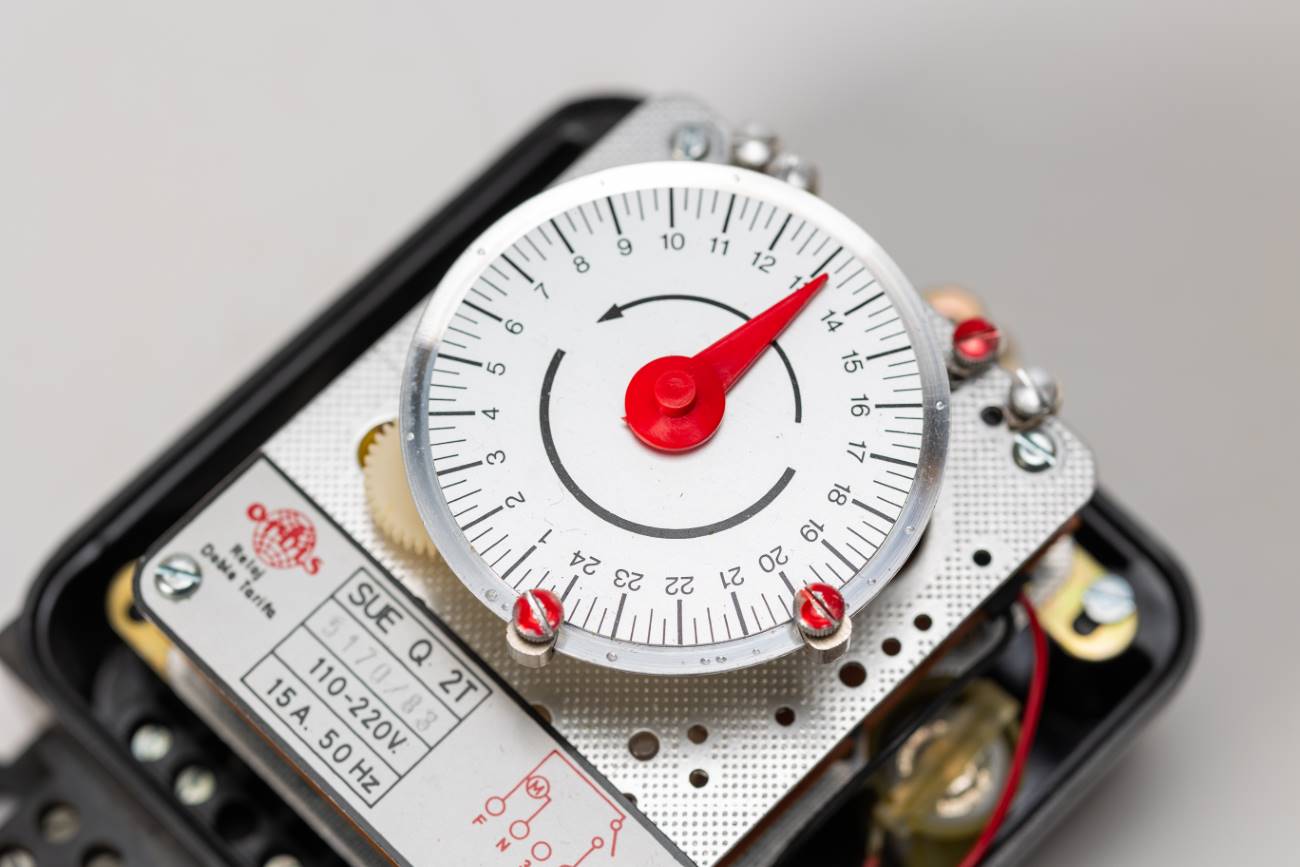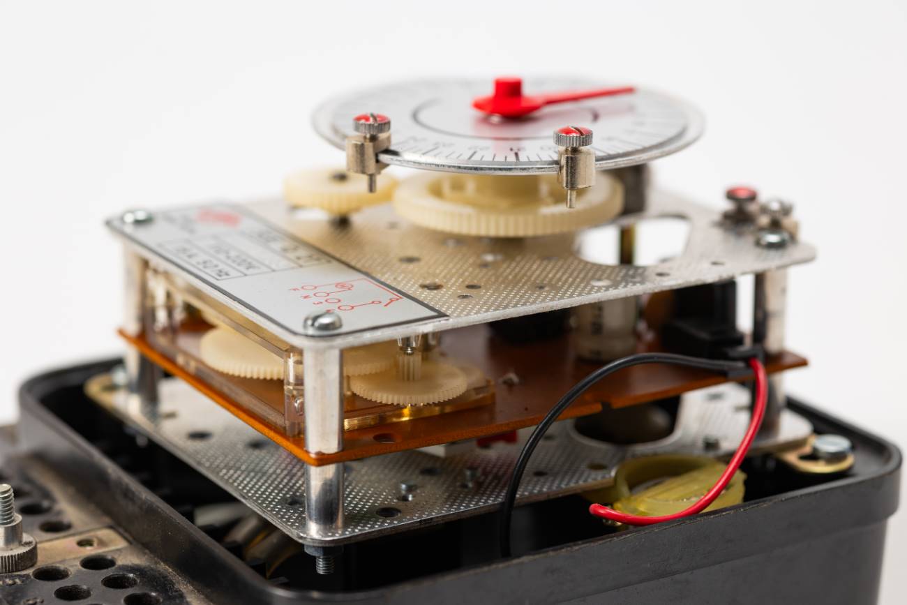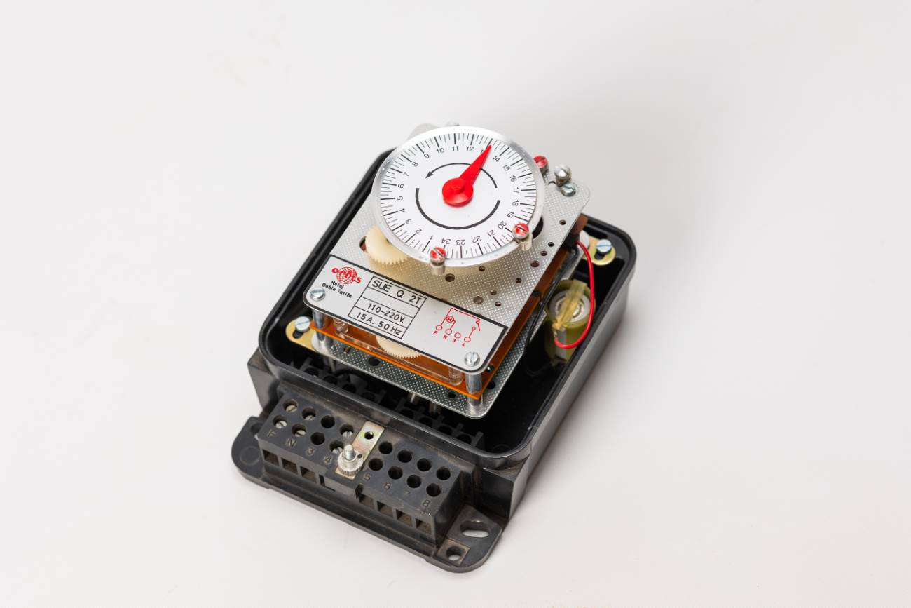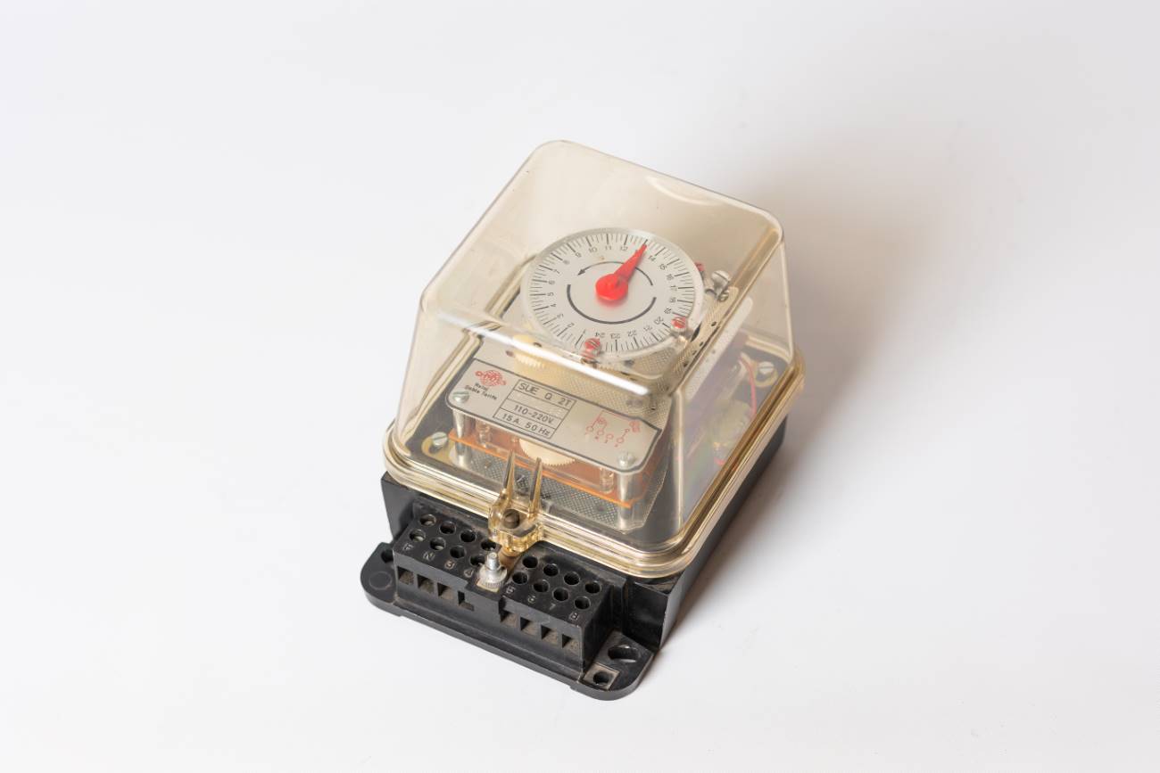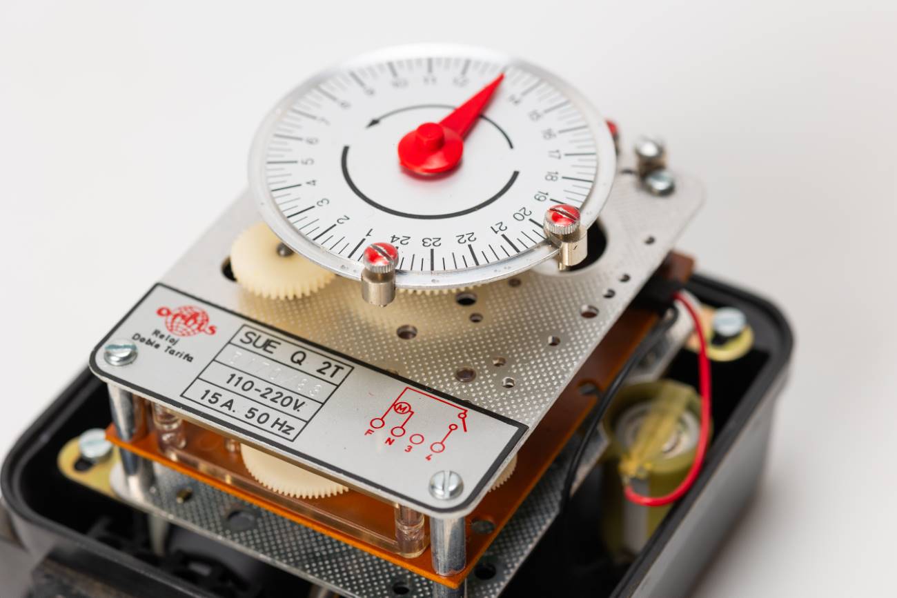 Reloj de doble tarifa inserto en una caja de plástico transparente para su protección. El mecanismo se sitúa sobre una peana de plástico negro.