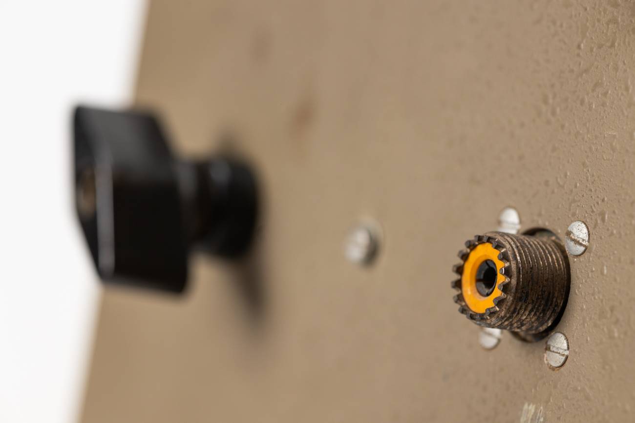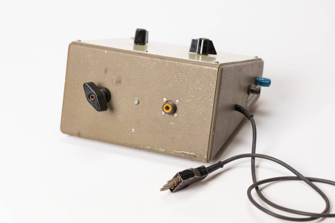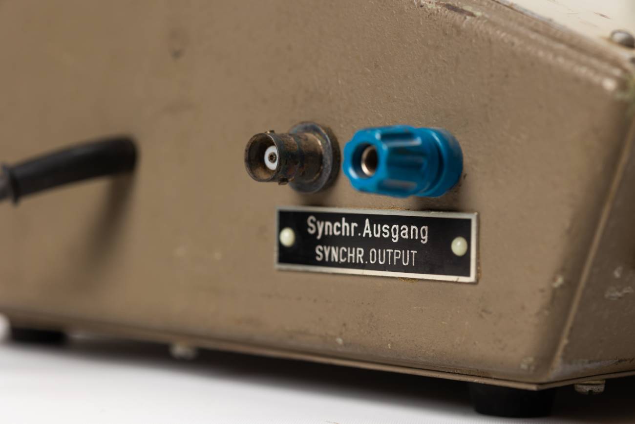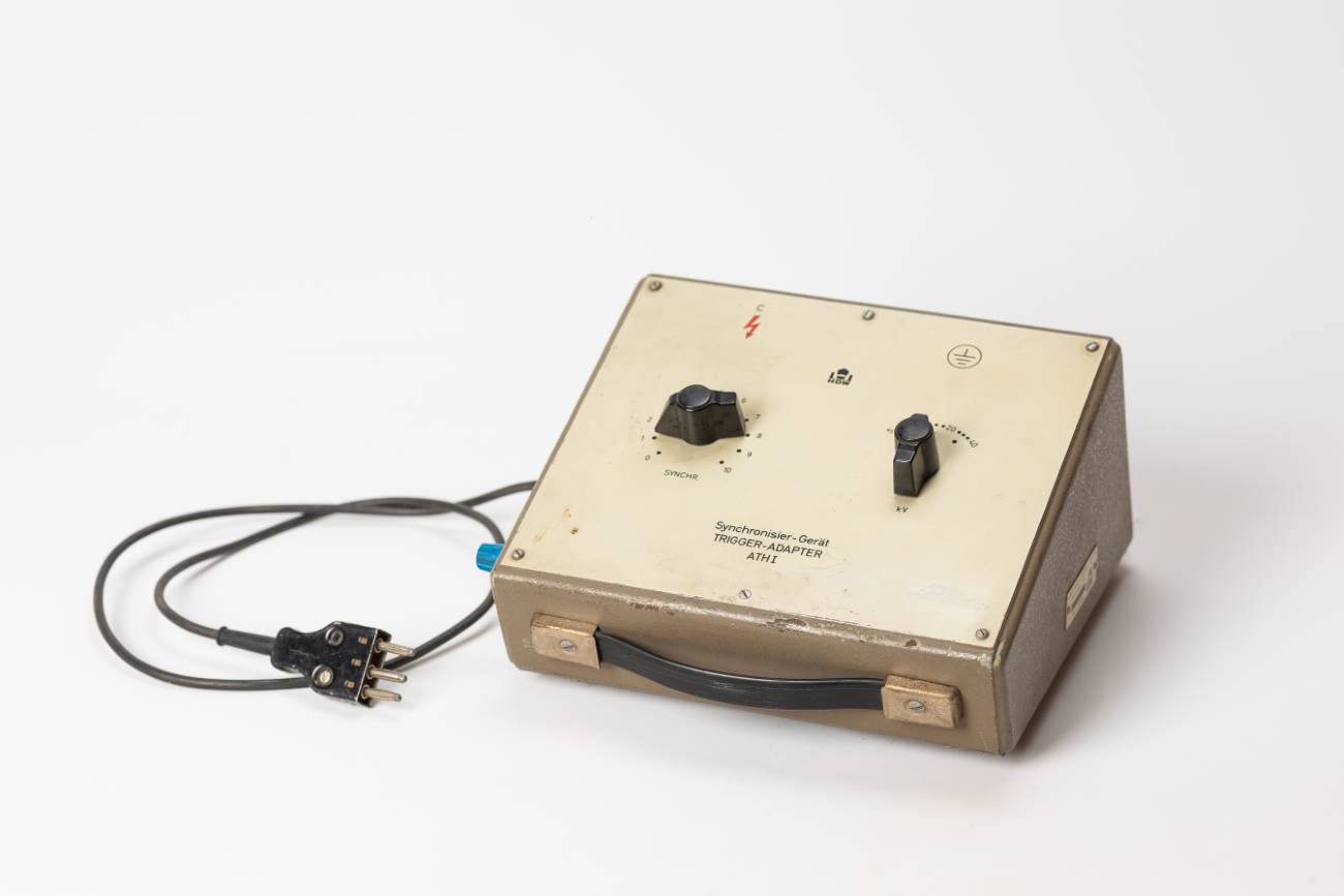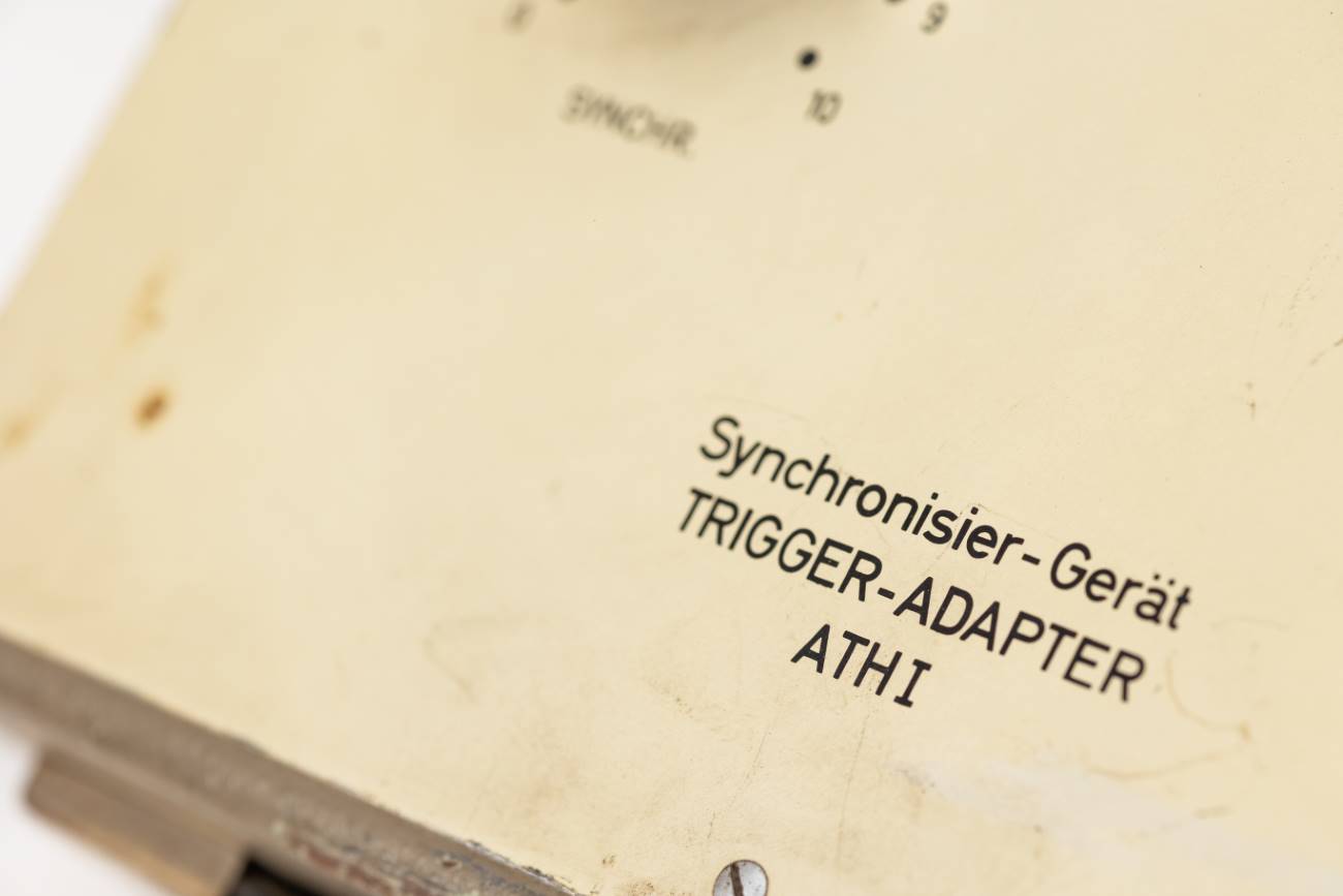 Dispositivo sincronizador de disparos. Liter. Syncronisier-Gërat Trigger adapter ATH I. Caja metálica portátil con salidas para conectores en la parte izquierda. Asa de goma en el frontal para su transporte.