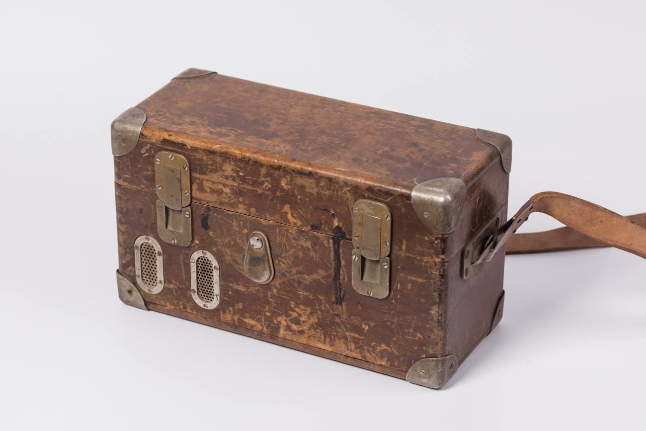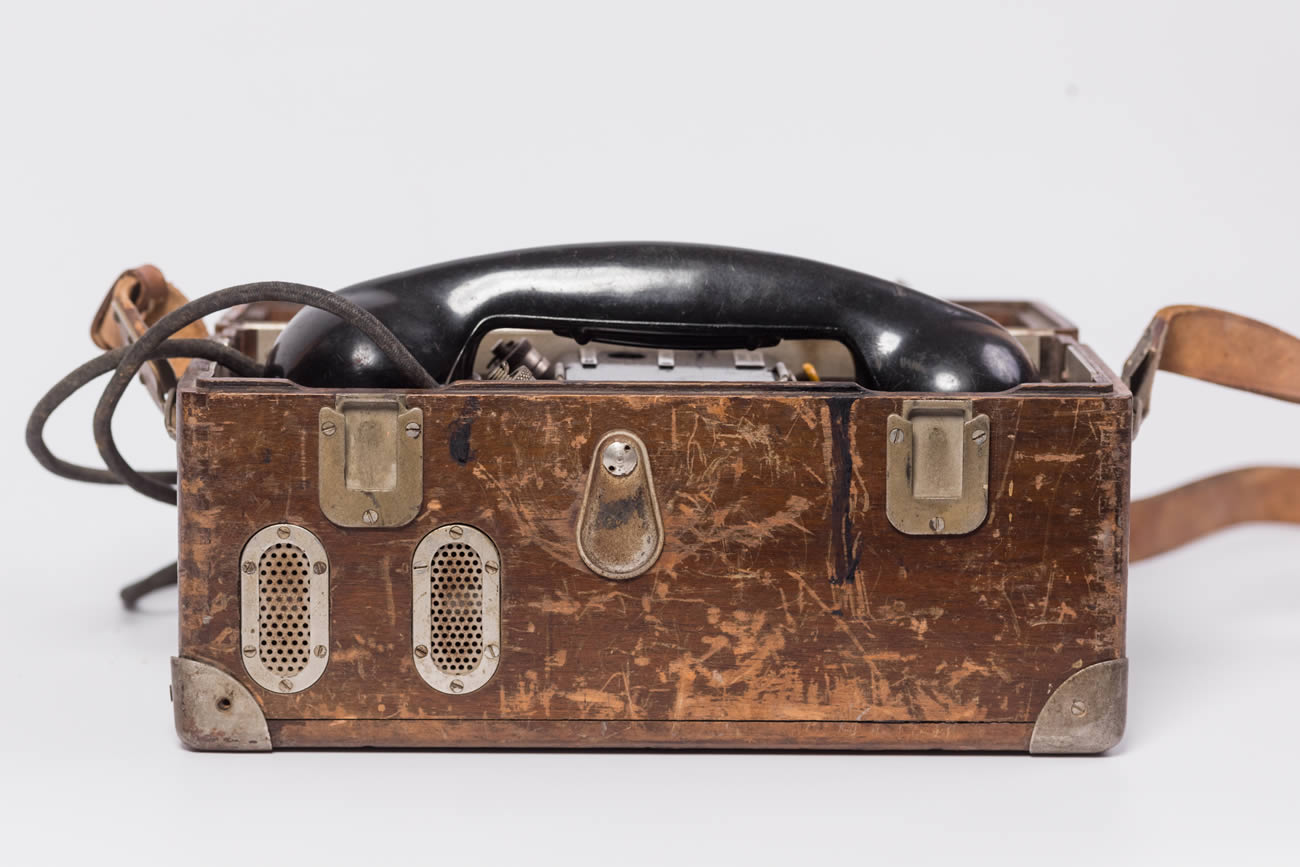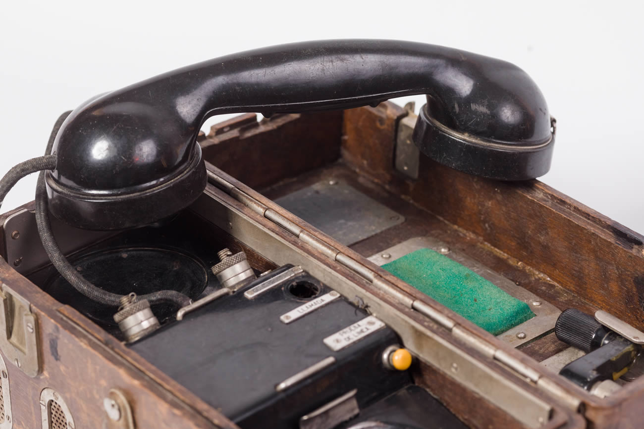 Teléfono portátil o de campaña en caja de madera reforzara y correa de cuero. Incluye la caja de transmisión, los bornes de conexión y el auricular de baquelita negra. Tiene batería local (una pila de petaca en el interior de la caja).