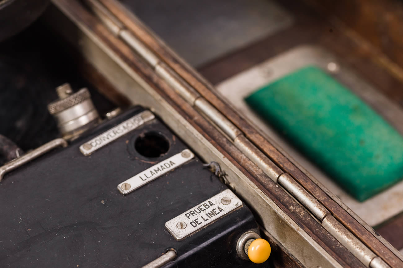 Dispone de una manivela exterior para realizar llamada por magneto. Dentro se encuentran todas las piezas necesarias para establecer la conexión. En el interior de la tapa se puede observar un panel con el esquema de los circuitos.
