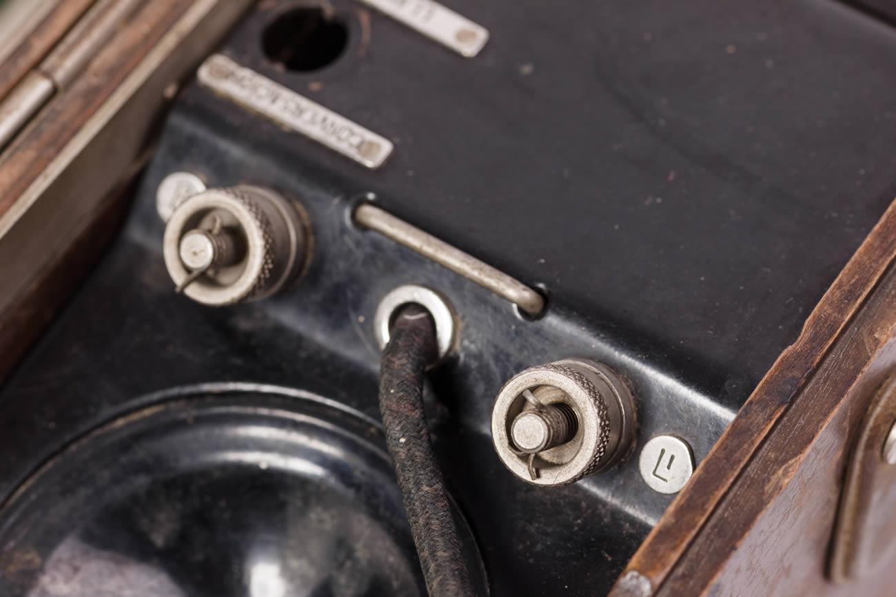 Para su funcionamiento era necesario conectar el teléfono a un poste de línea. La corriente de llamada era generada por un magneto accionado por el usuario mediante una manivela que en este caso se guarda en el interior de la tapa y se coloca en el exterior para accionarlo.