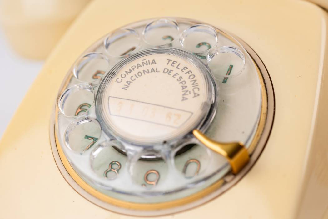 Teléfono Heraldo fijo con dial donde se puede leer que es de «LA COPAÑIA TELEFONICA NACIONAL DE ESPAÑA» fecha fabricación 31/03/62, realizado en plástico resistente y baquelita