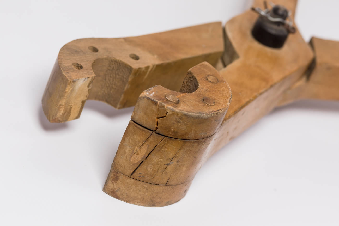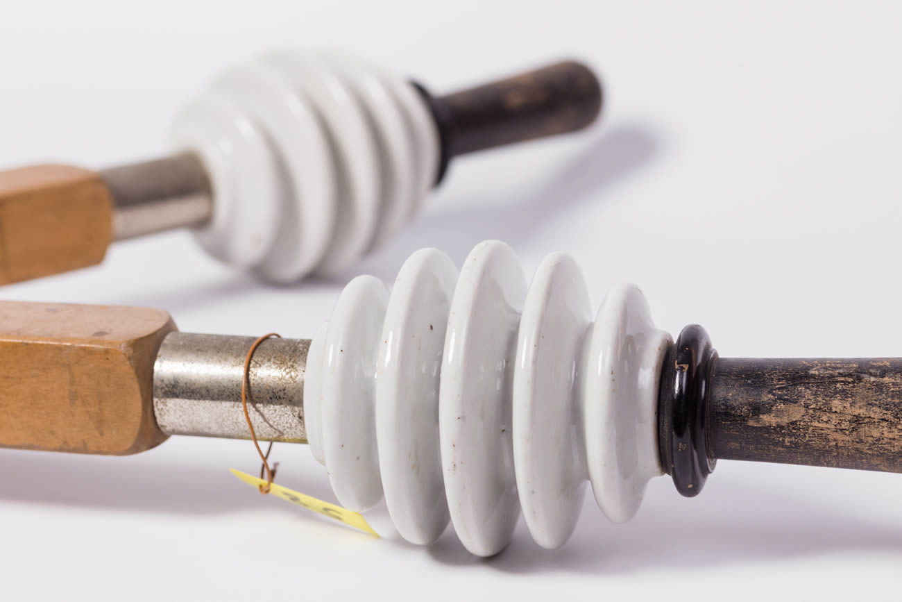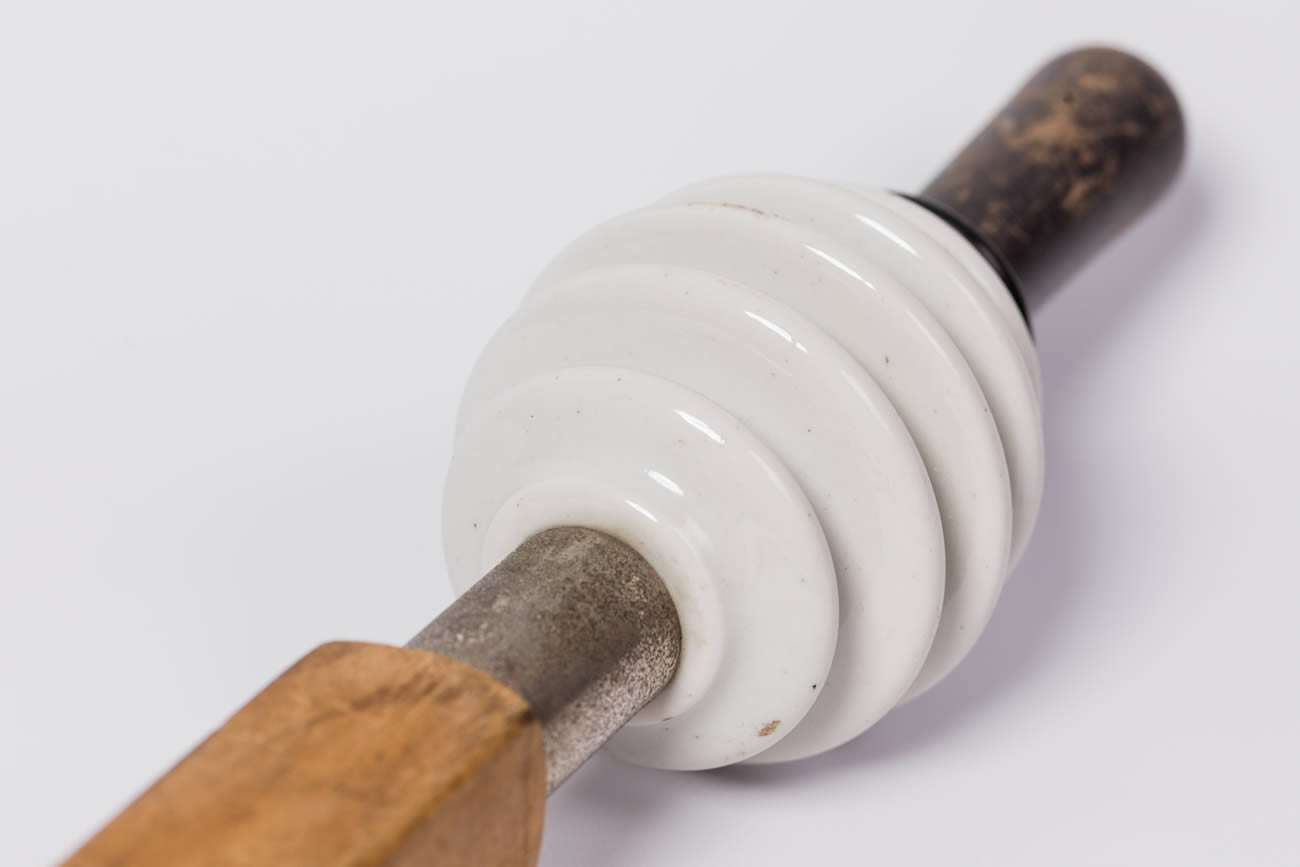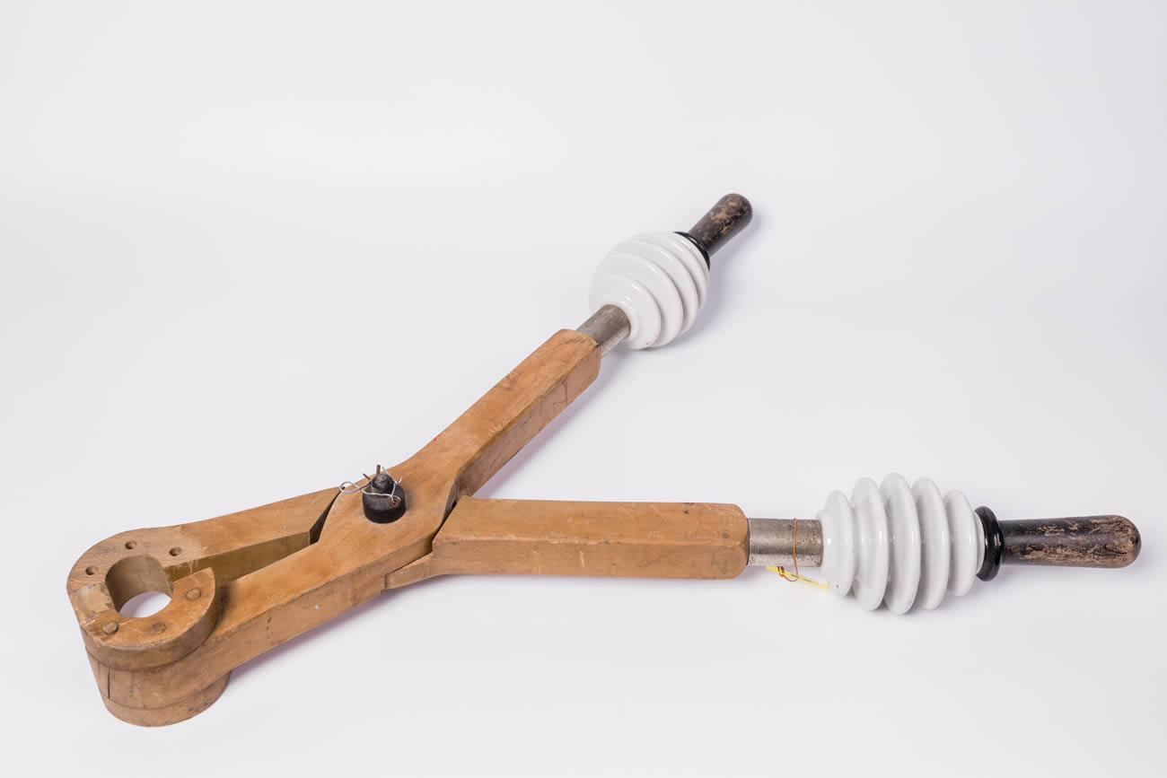 Grandes pinzas de madera y metal para sujetar cable, con aislador de porcelana.