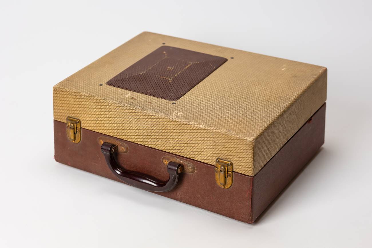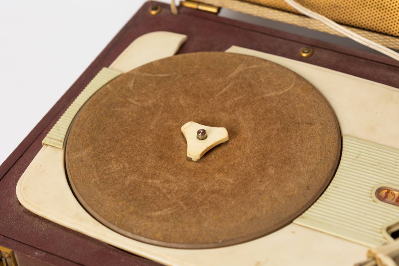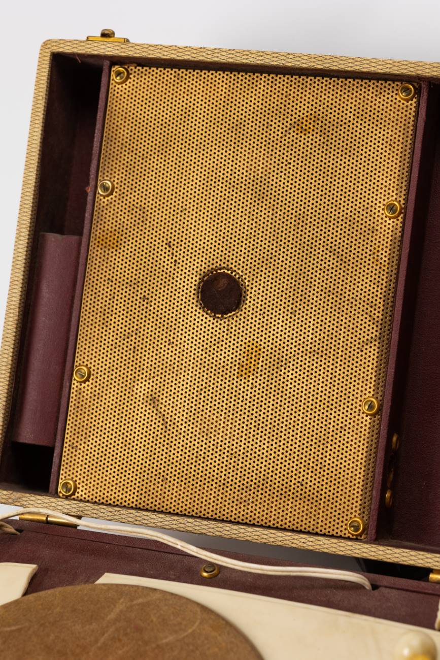 Tocadiscos en caja de madera portátil forrada con papel pintado y tapa con cierre de hebillas. Rejillas para salida de audio en el lateral izquierdo y sobre la tapa. Asa de porteo en el frontal. En el interior cable de alimentación con enchufe convencional de dos puntas. Donado por BAÑULS SOLER