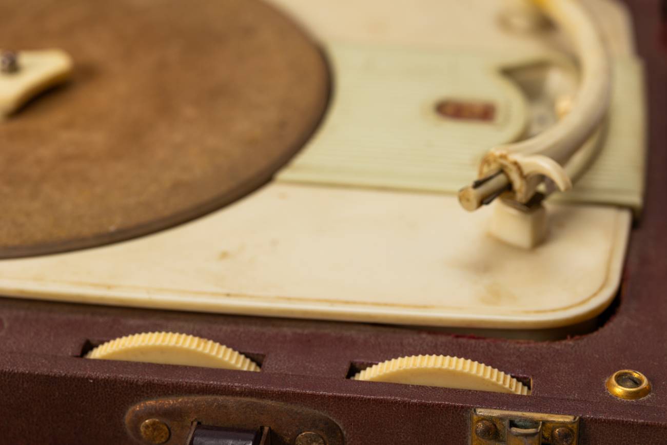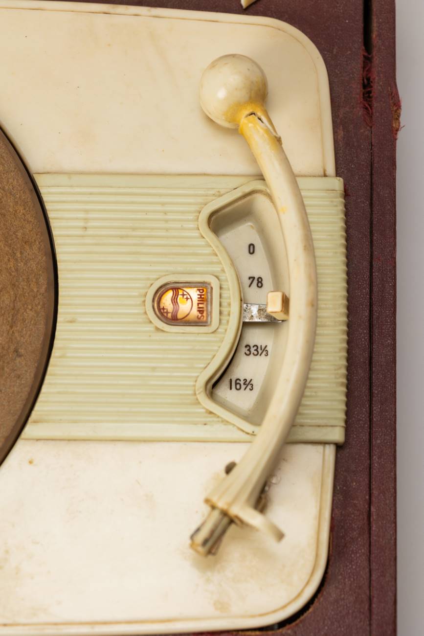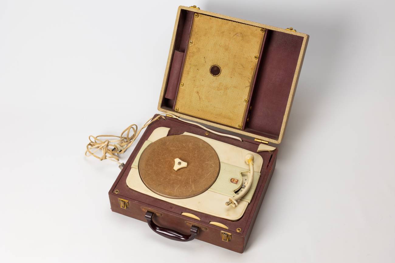 Tocadiscos en caja de madera portátil forrada con papel pintado y tapa con cierre de hebillas. Rejillas para salida de audio en el lateral izquierdo y sobre la tapa. Asa de porteo en el frontal. En el interior cable de alimentación con enchufe convencional de dos puntas. Donado por BAÑULS SOLER