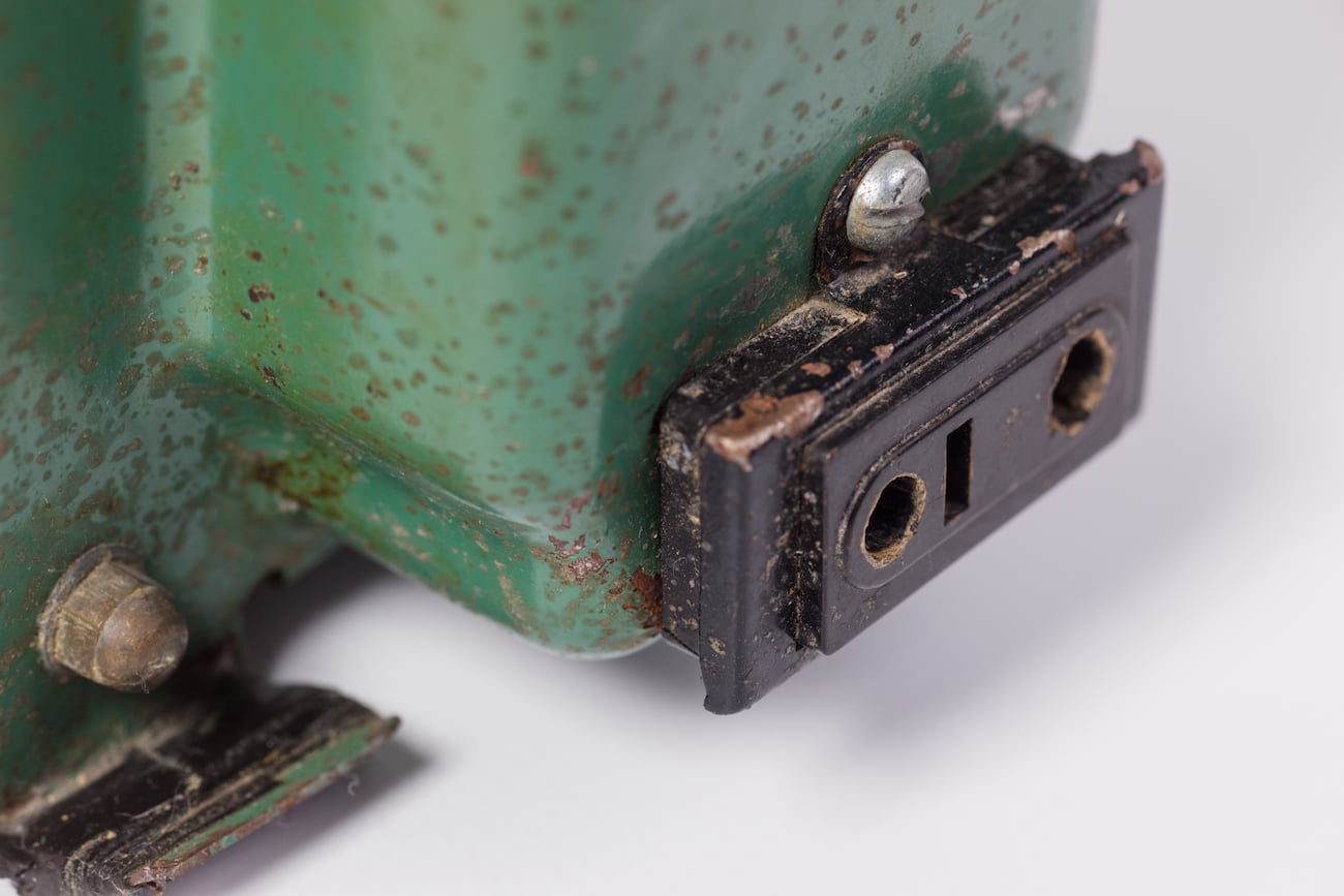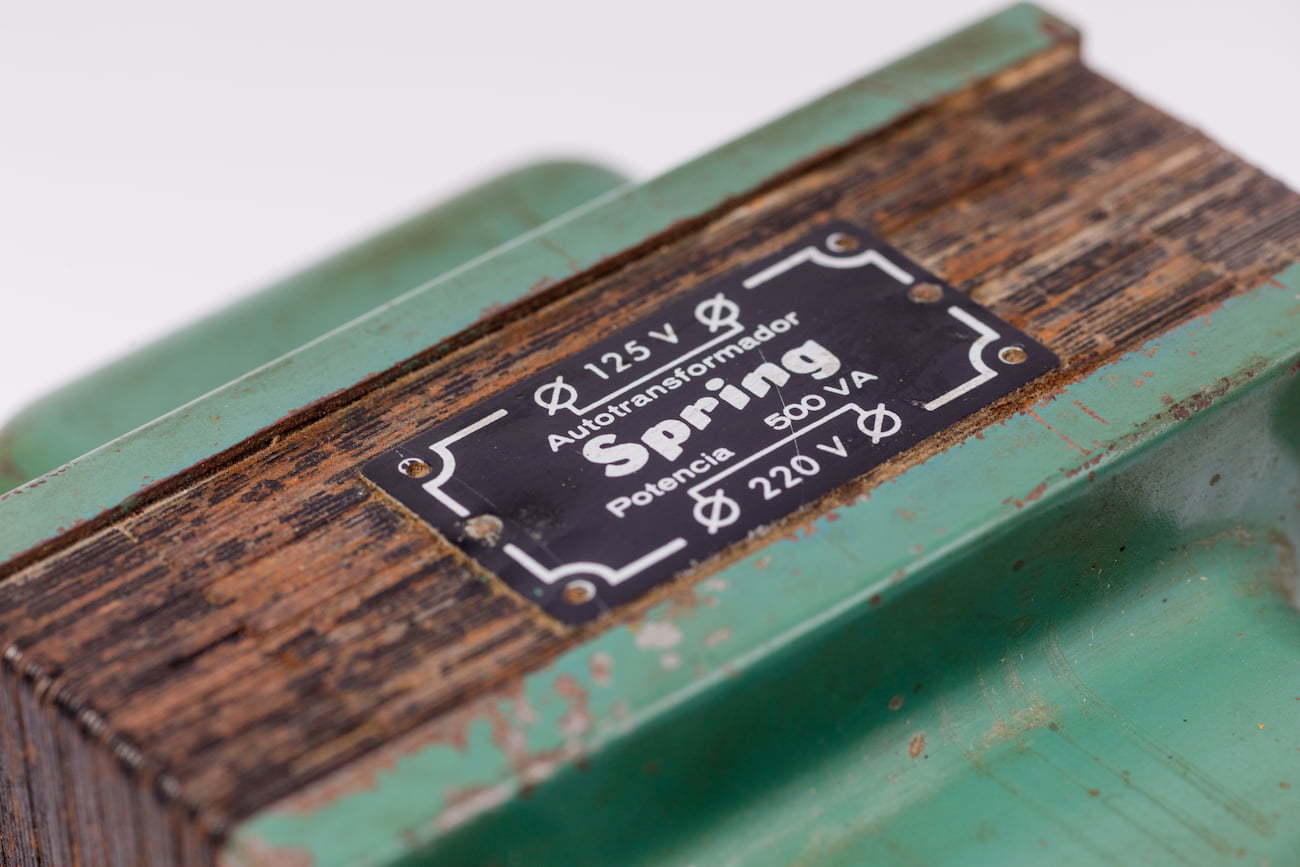 Transformador de 220V a 125V con carcasa de metal de color verde. Portátil, con asa metálica.