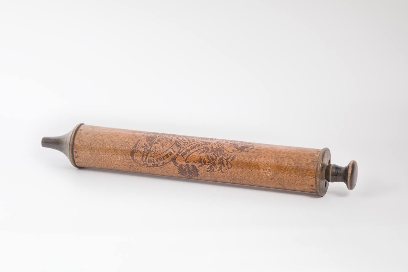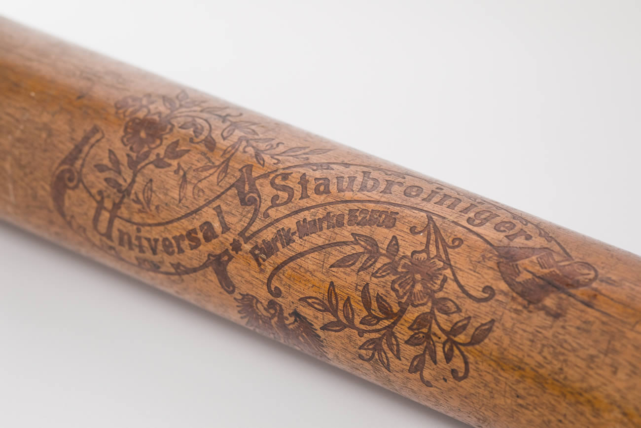 Limpiador de polvo universal. Se trata de un cilindro de madera con fuelle y boquilla, que funciona a modo de bomba de aire.