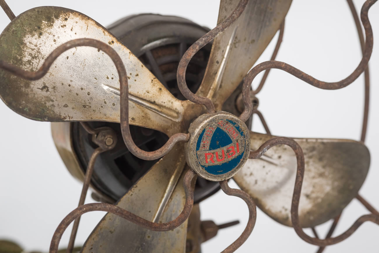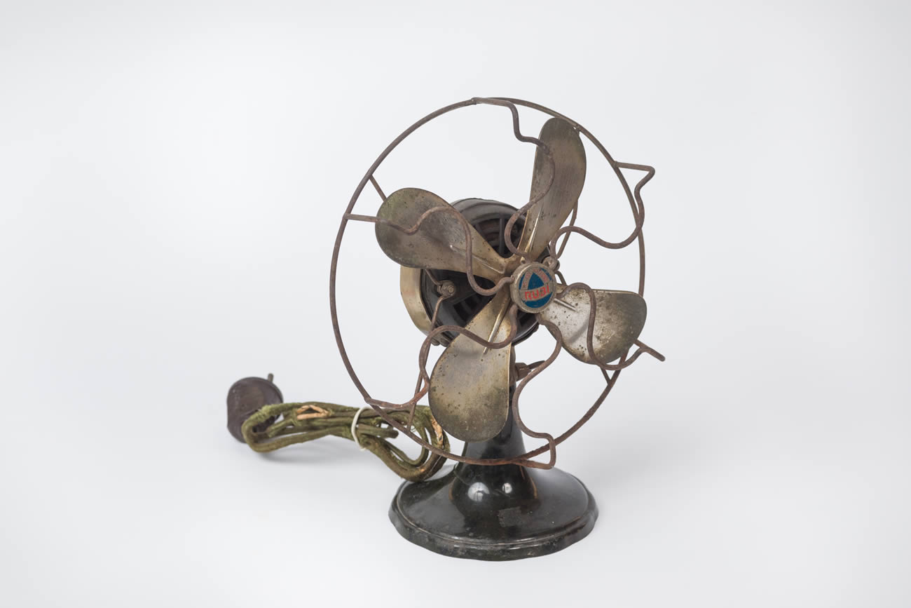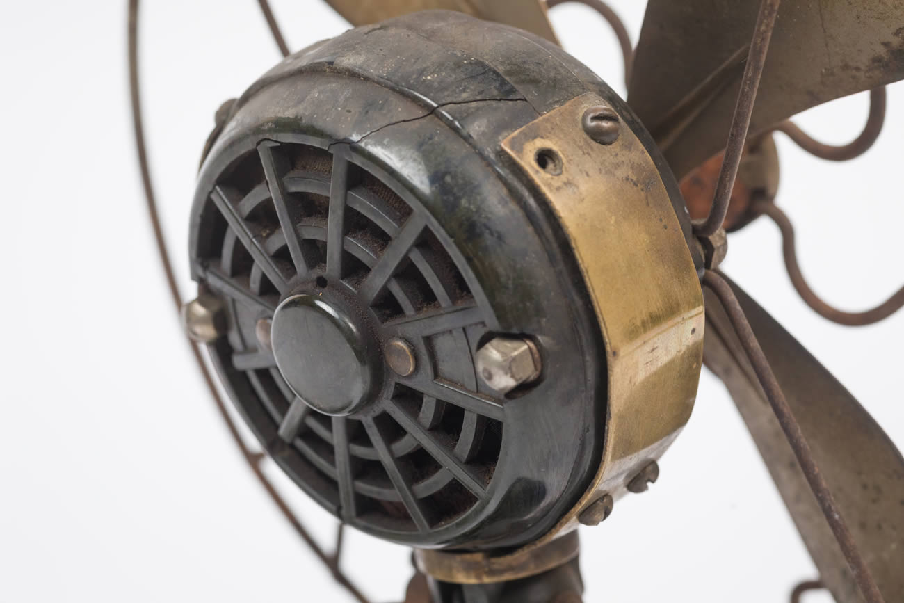 Ventilador que se apoya en pie de baquelita, con cuatro aspas de latón. Éstas están cubiertas con una rejilla de protección. Con cableado y enchufe.